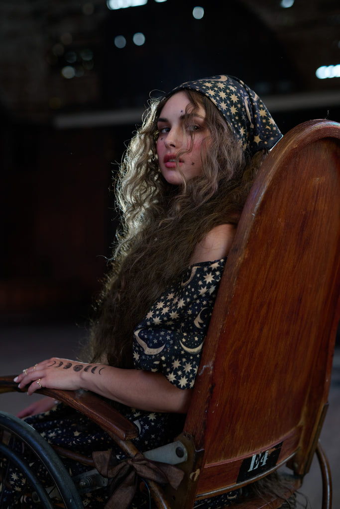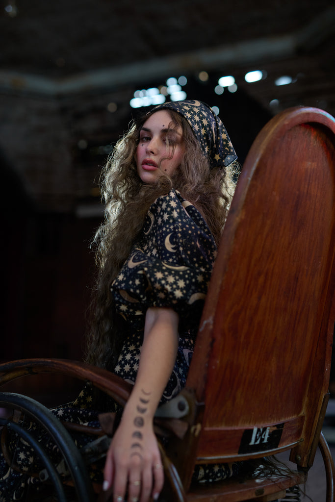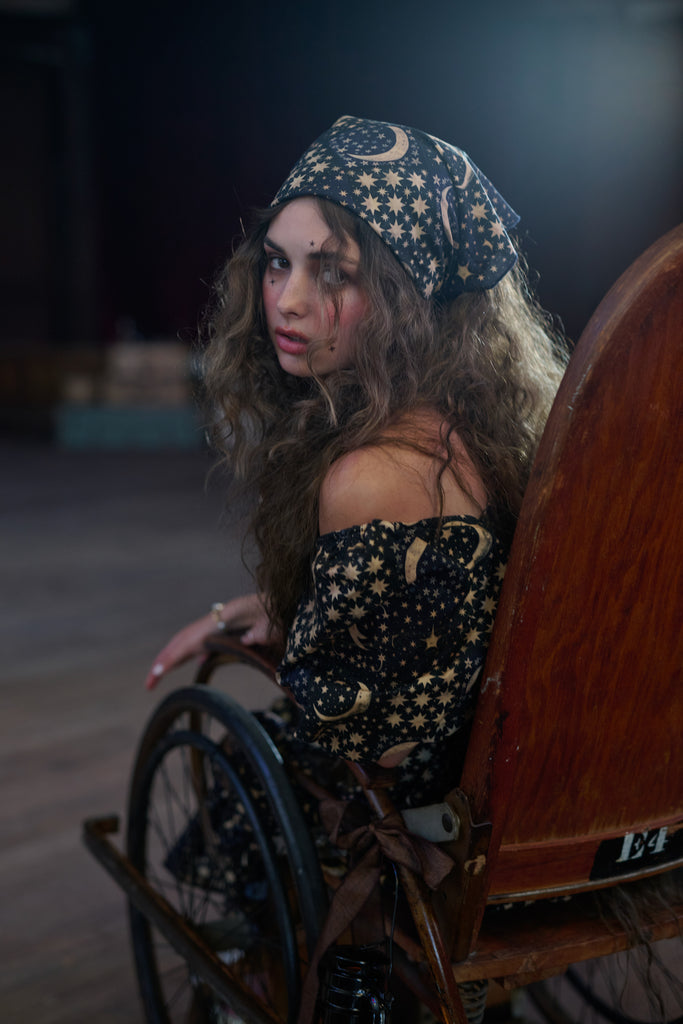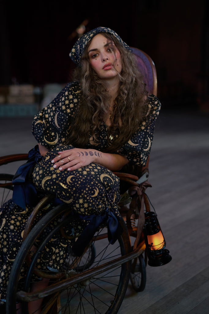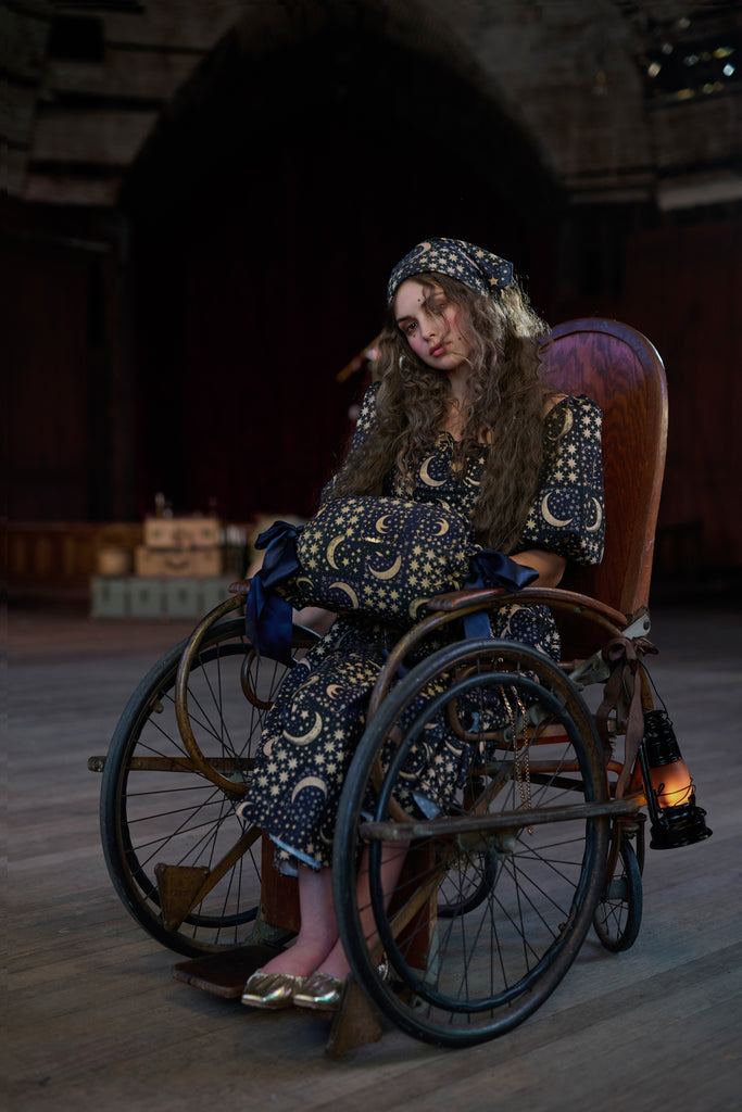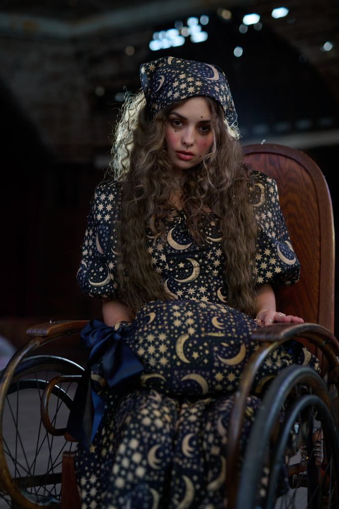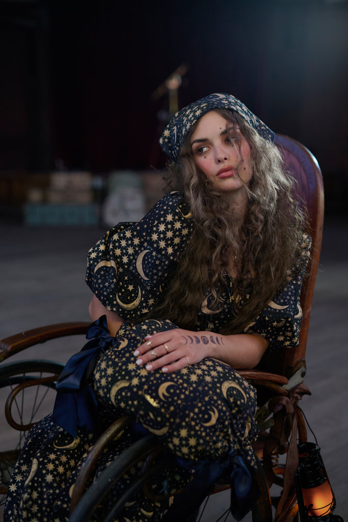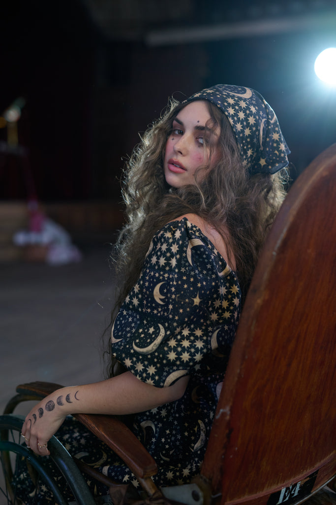 Our beloved Day Dress returns in a celestial print on a background of rich black, reminiscent of star-studded night skies and antique astronomical charts. It features a comfortable cotton cut with curve-hugging princess seams, voluminous puff sleeves, and an adjustable tie at the bust. Crafted entirely from cotton, this dress remains cool and crisp, ensuring maximum comfort.