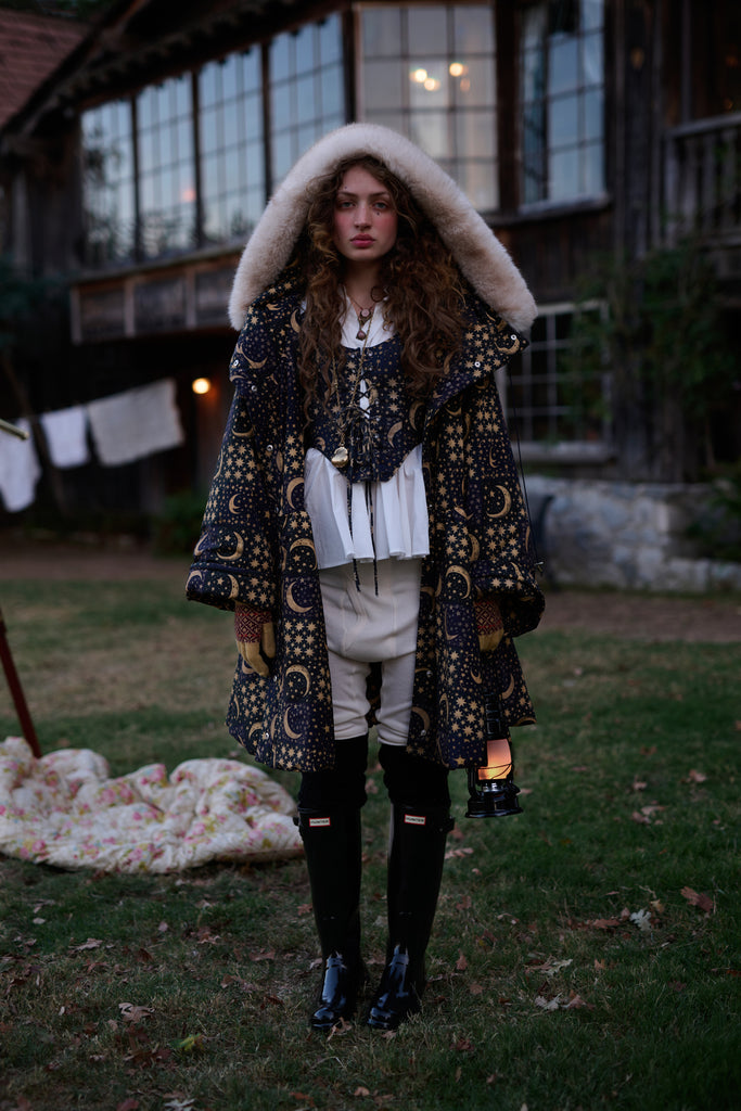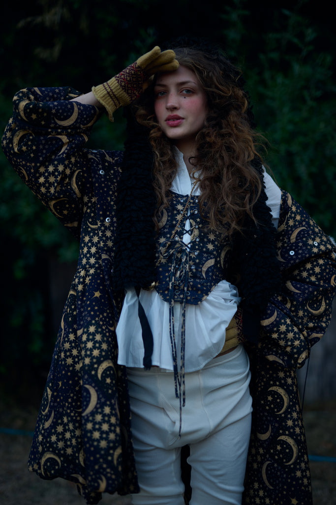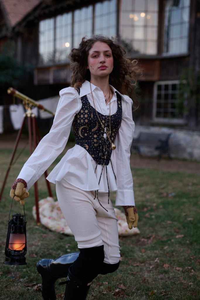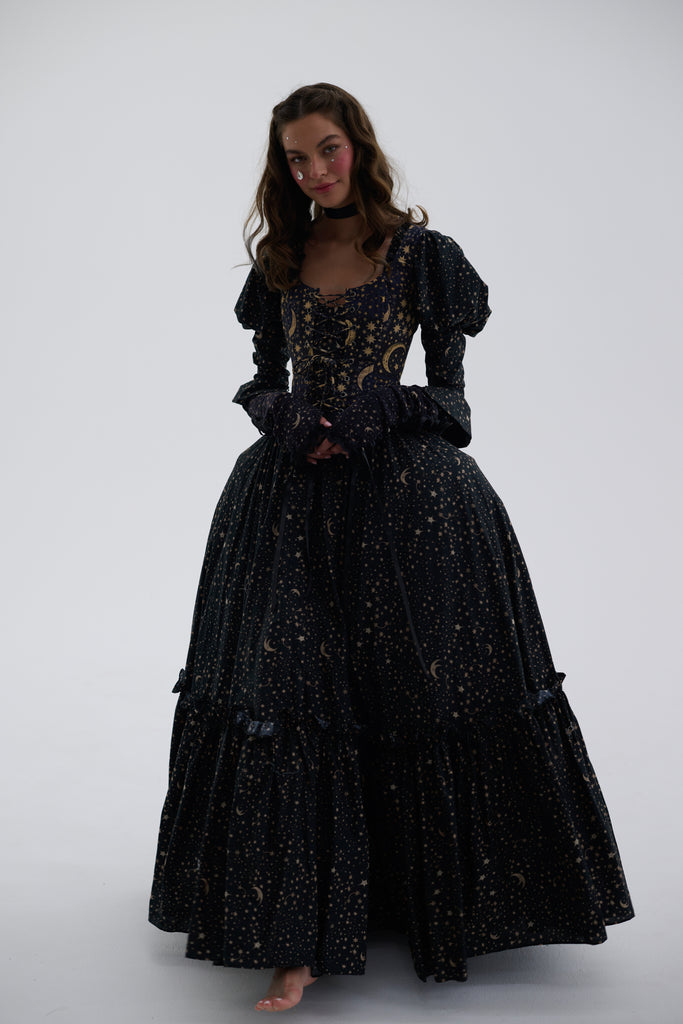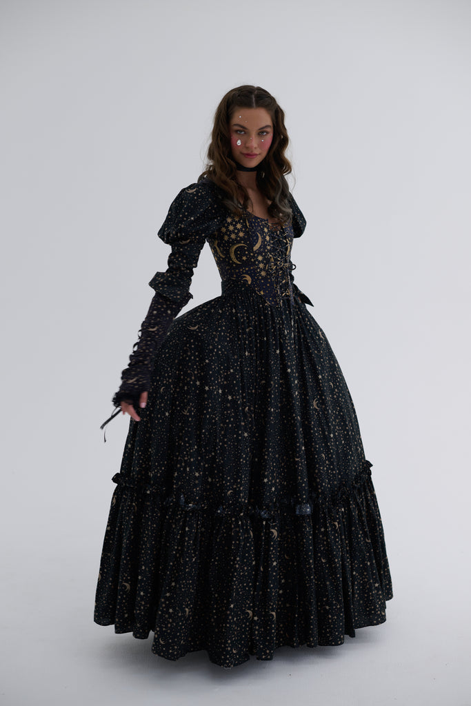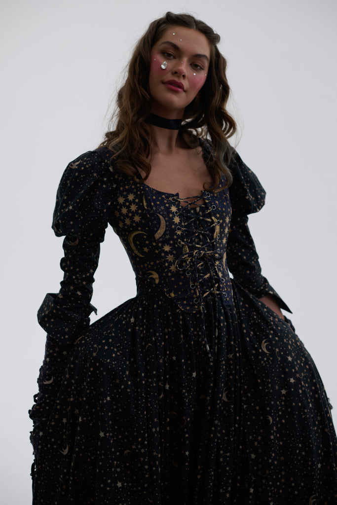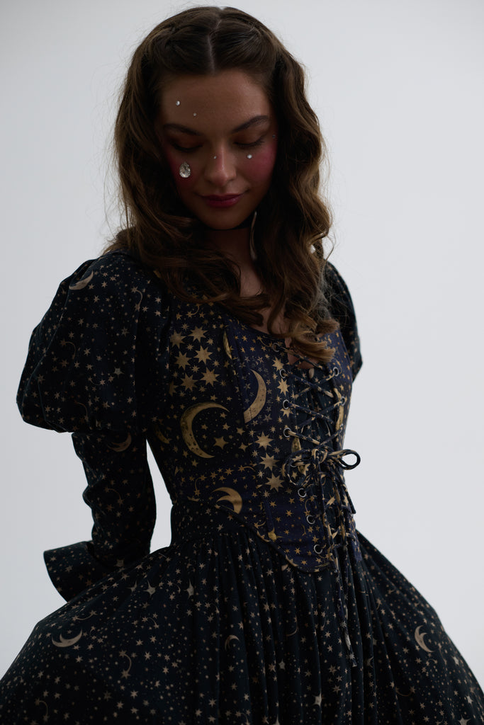 In a pattern as mesmerizing as the night sky, featuring celestial bodies on a rich background, the Duchess Corset now channels Edwardian stargazing elegance in 100% heavy cotton! This fully boned corset laces up with two draw chords, allowing you to control the cinch as precisely as an astronomer fine-tunes their telescope. Whether you're pondering circadian rhythms or attending a scientific lecture, you'll captivate admirers from moonlit observatories to star-studded galas.