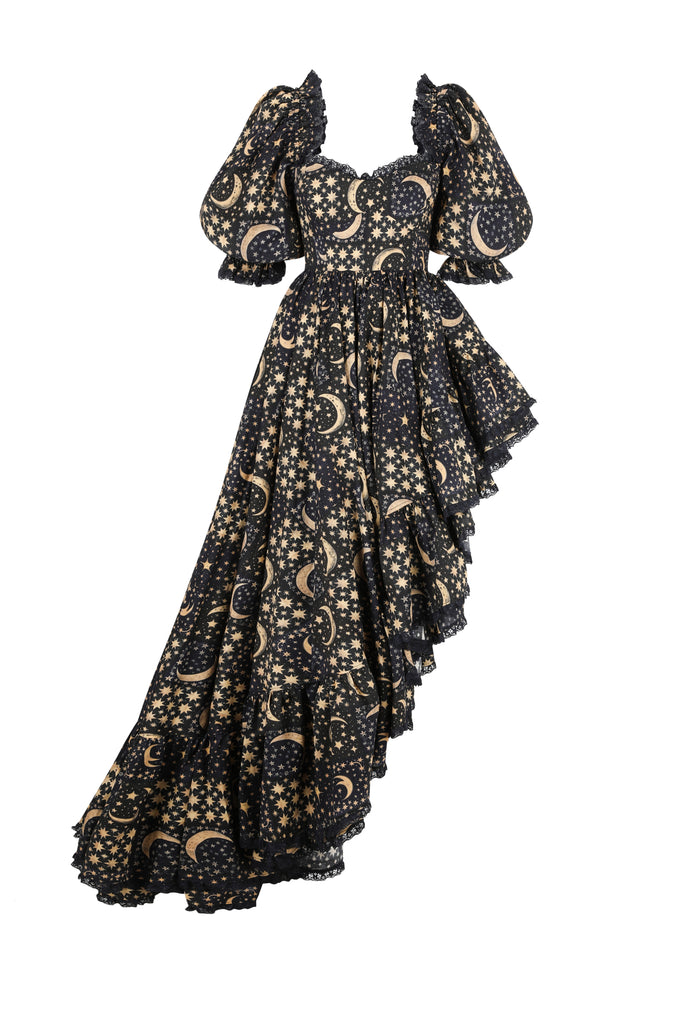 In a pattern as mesmerizing as the night sky, this dress evokes the elegance of Edwardian astronomers. The asymmetrical silhouette flows with mid-length puff sleeves and romantic lace trim detailing, while a pleated ruffle hem brings both structure and drama. Finished with corset lacing at the back for a heavenly fit.