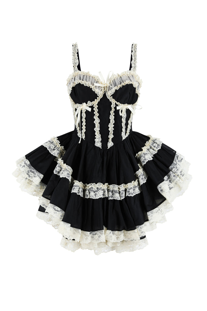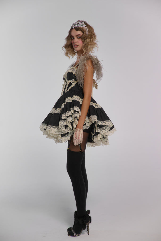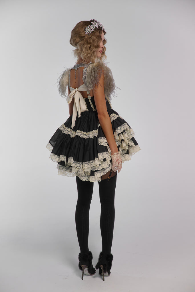 This silk organdy mini, with its sweeping pleated skirt, belongs in smoky speakeasies and beneath champagne towers. Underwire cups and a silk-gauze bust lift and shape, while satin ribbons and lace trim recall the glamour of Les Années Folles. Boning at the waist sculpts the silhouette perfectly. The dress you wear when slipping out of faux fur coats, cheeks flushed, finger waves falling loose.