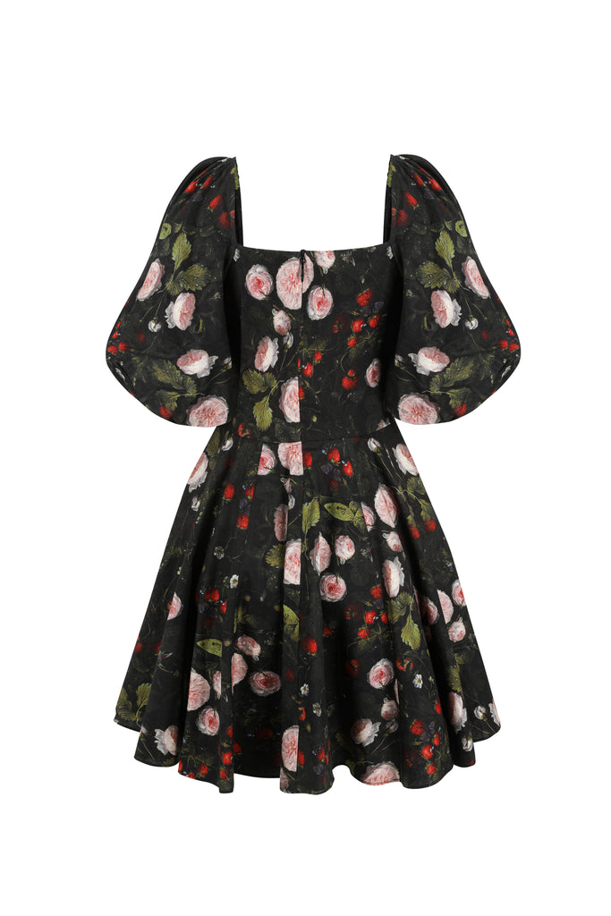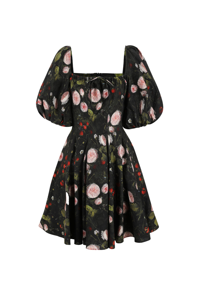 This mini version of our classic Day Dress features dark botanical prints that bloom with mysterious beauty. It features a comfortable cotton cut with curve-hugging princess seams, voluminous puff sleeves, and an adjustable tie at the bust. Crafted entirely from cotton, this dress remains cool and crisp, ensuring maximum comfort.