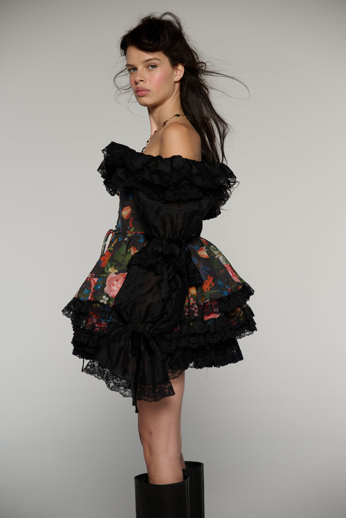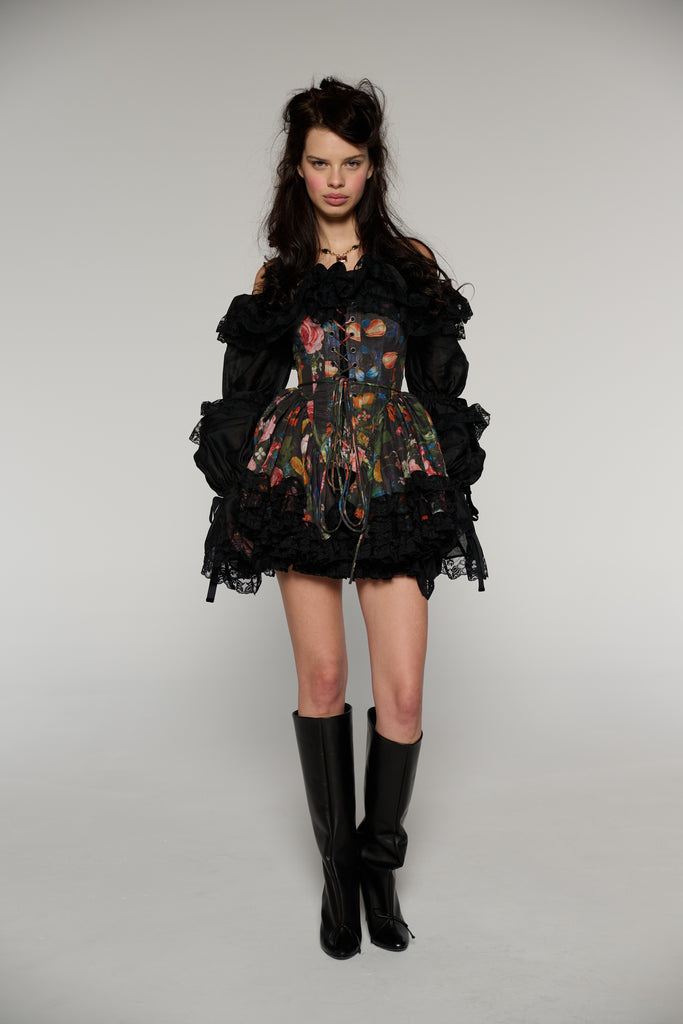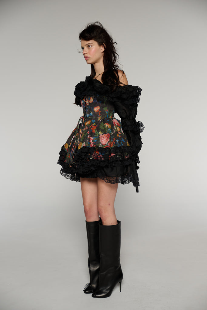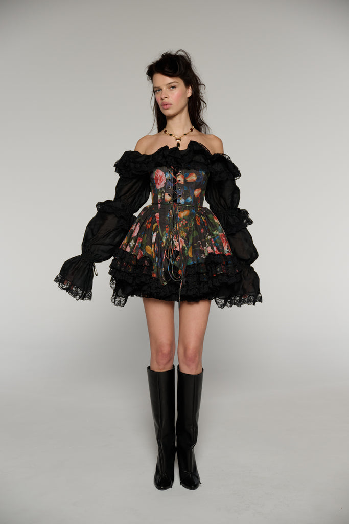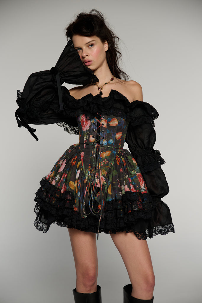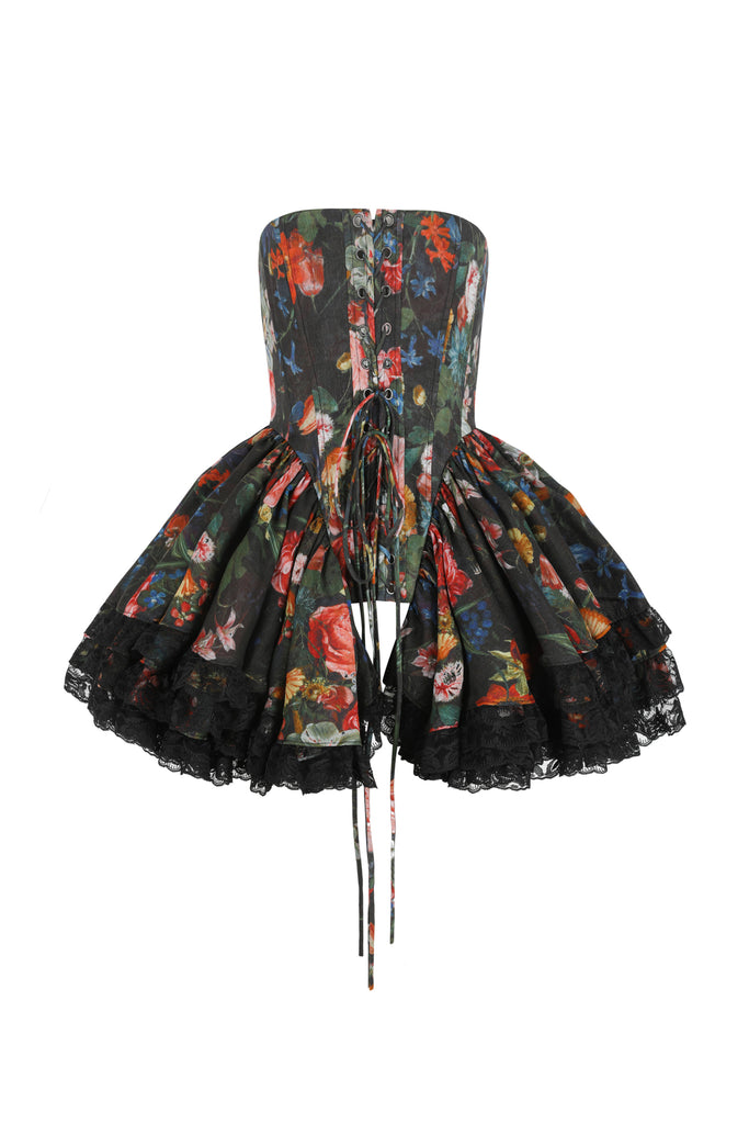 Adorned with the atmospheric beauty of an antique still life by Jan van Huysum, this cotton gauze Basque waist corset combines historical art with contemporary ease. The enchanting Nightcap print brings Dutch Golden Age florals to life across the structured corset and attached skirt, while front lacing with two draw cords shapes a feminine silhouette. Lace trim flourishes throughout.
