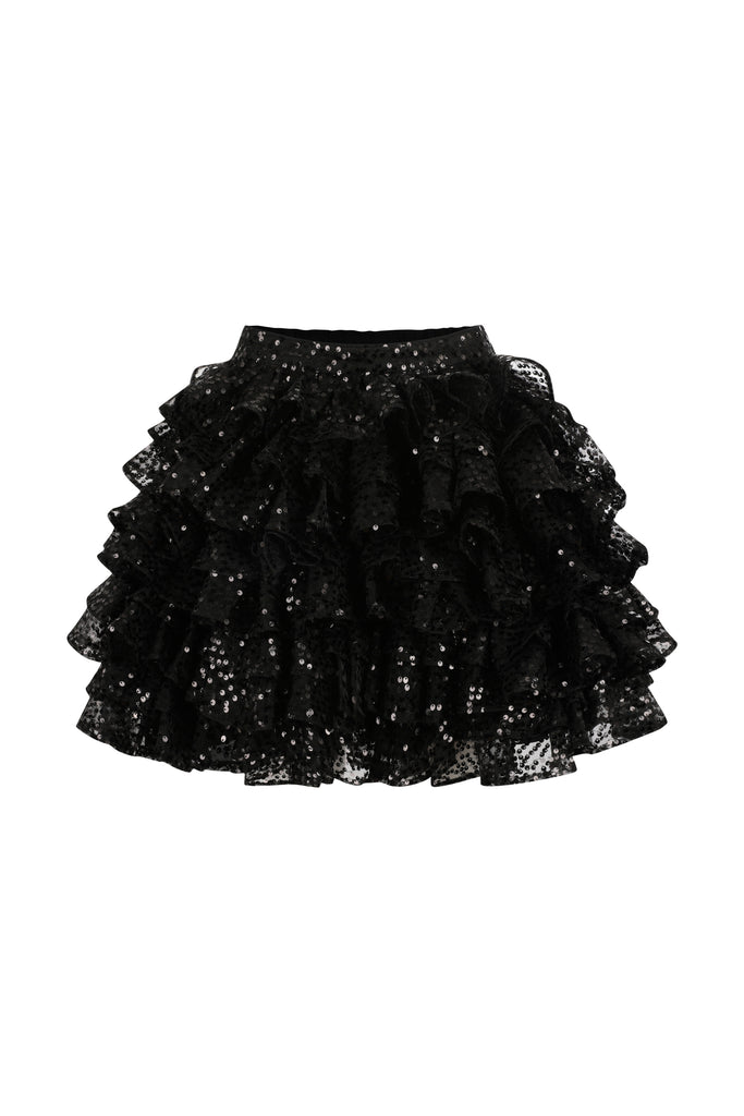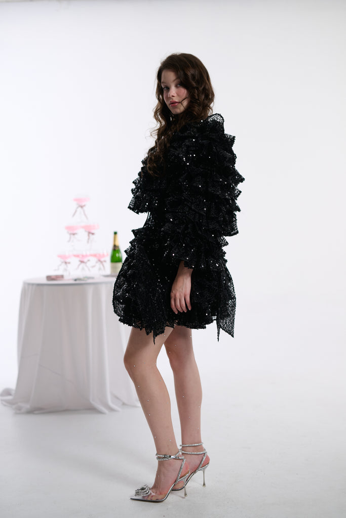 This ruffled black sequined fantasy is a wearable tutu that turns every venue into your personal dance floor. Layers of ruffles elongate the legs while sparkling like vodka drops in black-rimmed crystal. Whether you're crashing a VIP section or stealing the spotlight at dinner, this piece shimmers like your ex's tears in moonlight.