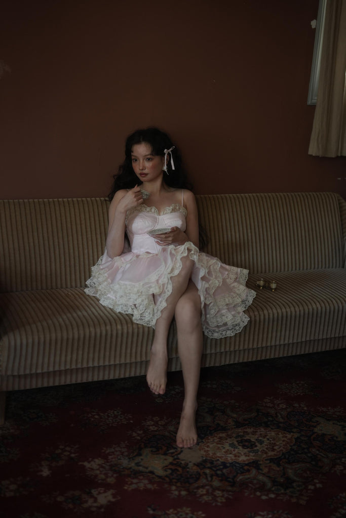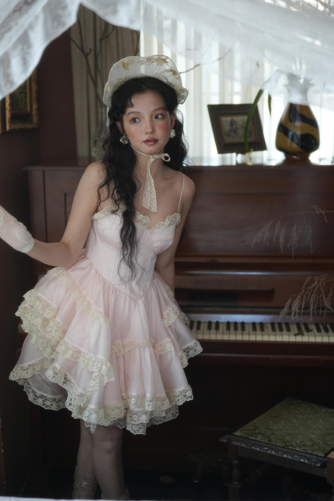 - Silk satin mini dress with voluminous pleated skirt and ruffled lace hem