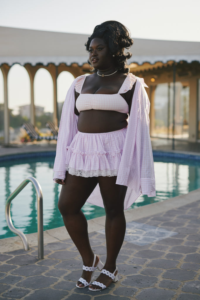 Selkie’s bikini debut is a nod to the classic, reminiscent of the iconic bikinis worn by bathing beauties of yesteryear, this suit is crafted in a classic spandex. Featuring ruffle straps and a gathered bust, this top showcases a sweet Pink Gingham print, a perennial favourite in Americana and British fashion and a beloved favourite of Selkie founder Kimberley Gordon.