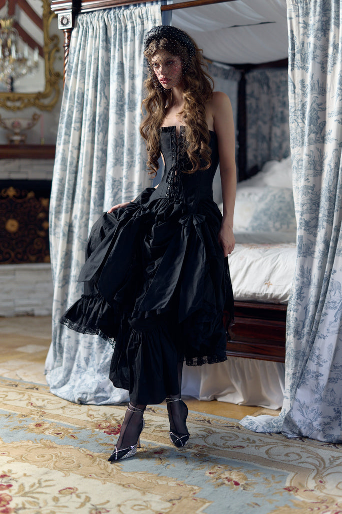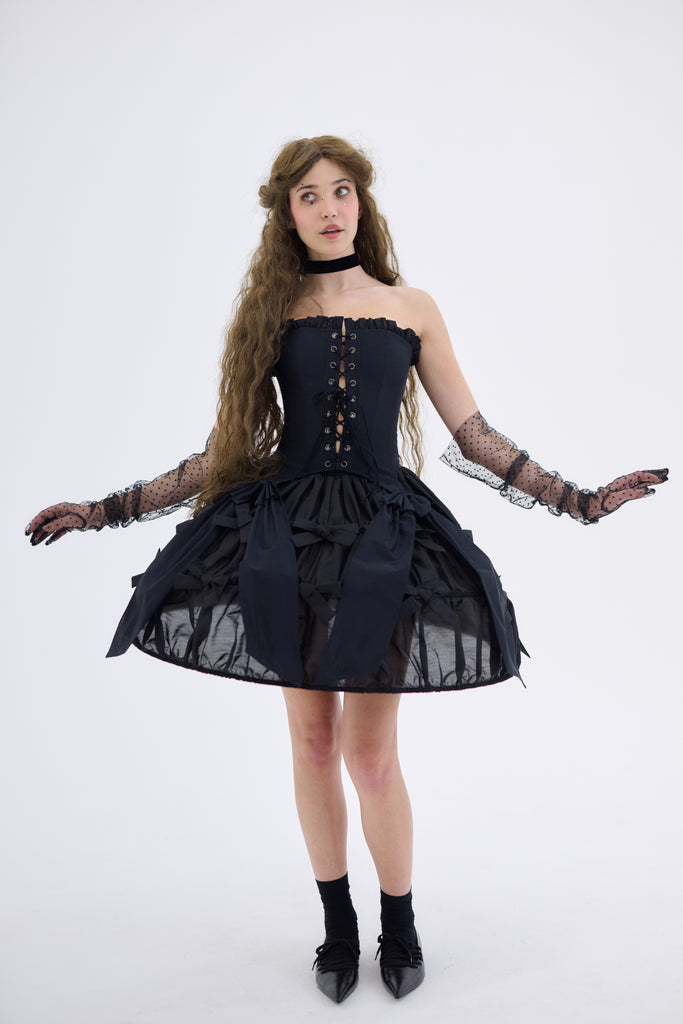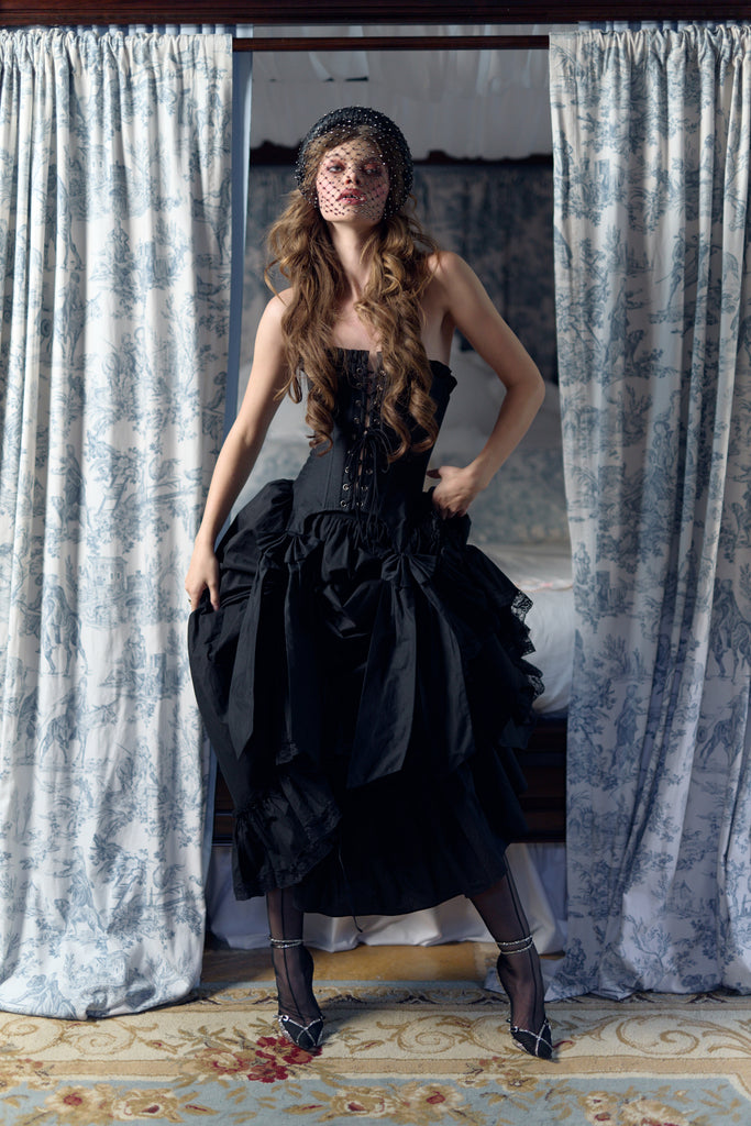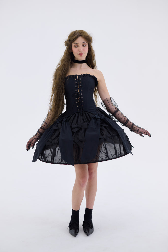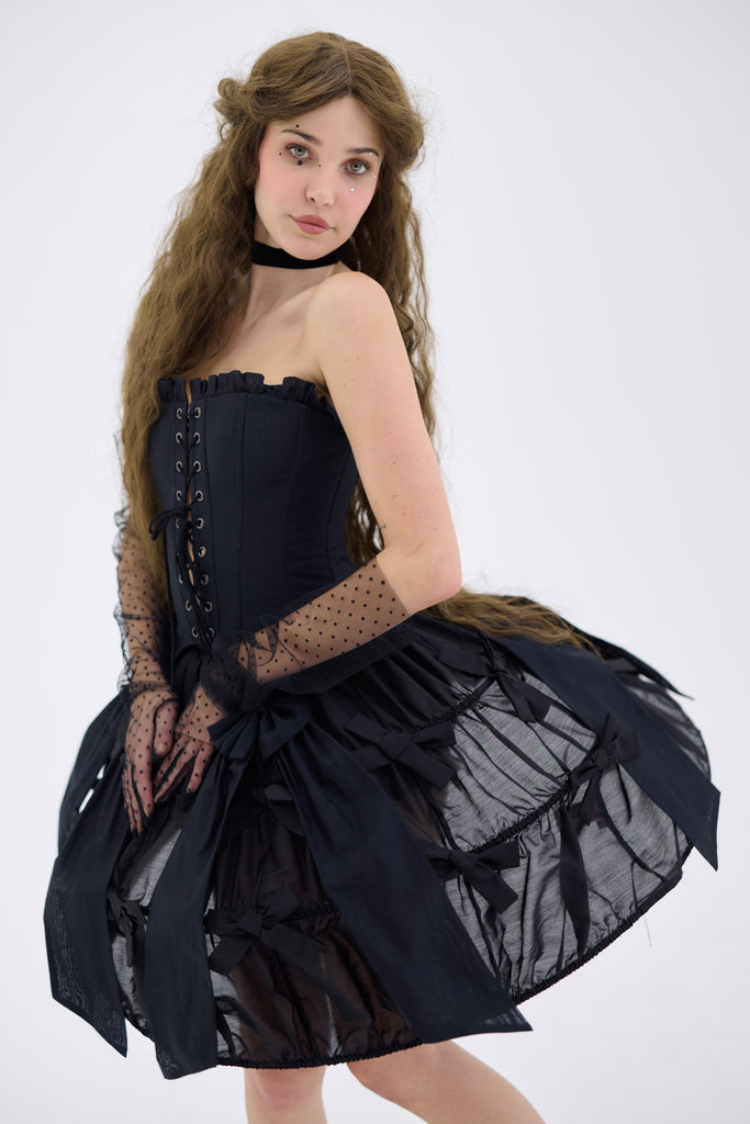 Strapless and fully-boned, the A La Mode Corset is designed to make you feel eternally beautiful—two fully adjustable draw cords lace up the center, so you may cinch it as you please. Tiny ruffle details at the bust add additional femininity, and garter bows descend below the waist.