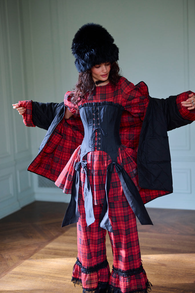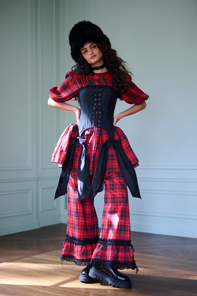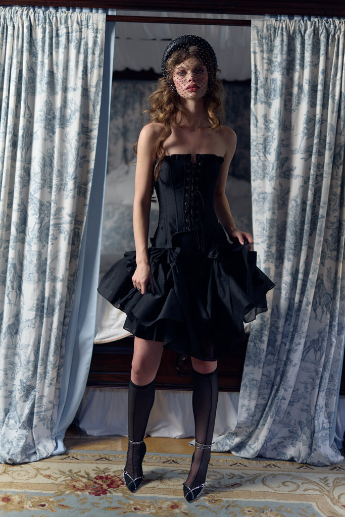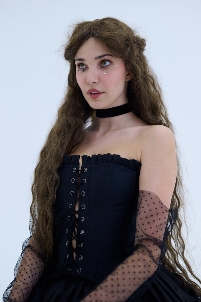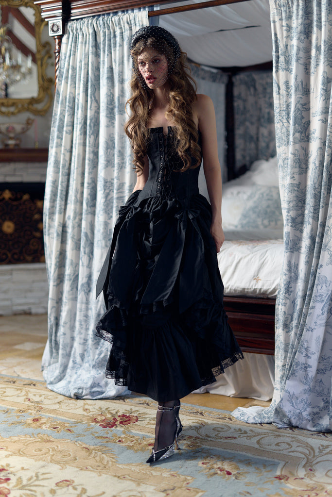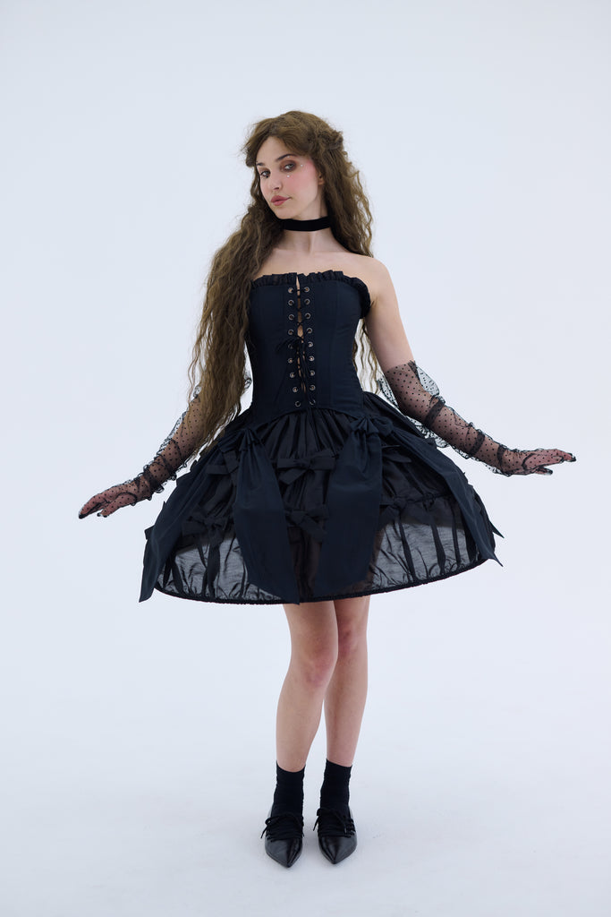 Strapless and fully-boned, the A La Mode Corset is designed to make you feel eternally beautiful—two fully adjustable draw cords lace up the center, so you may cinch it as you please. Tiny ruffle details at the bust add additional femininity, and garter bows descend below the waist.