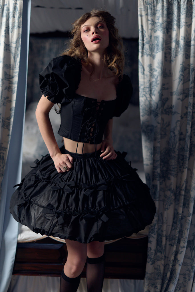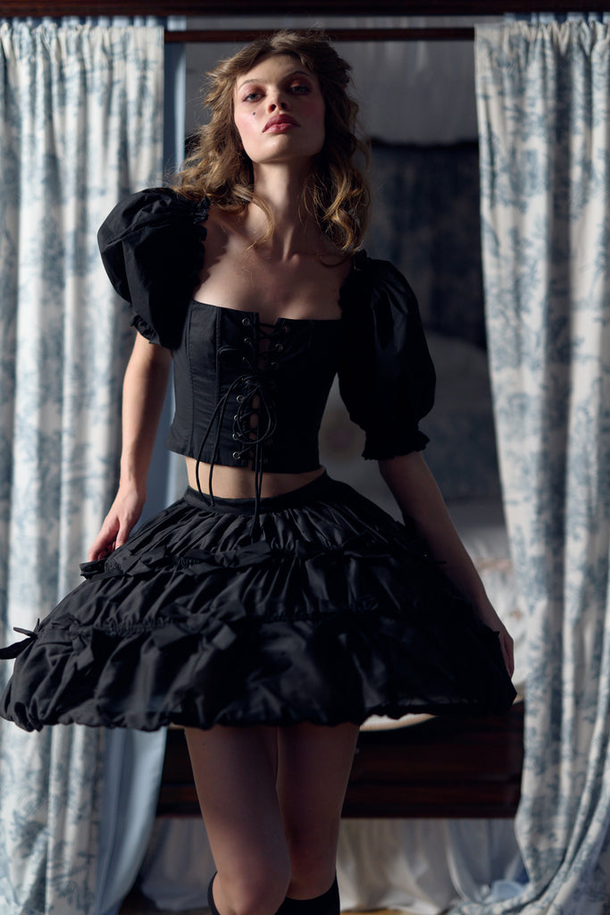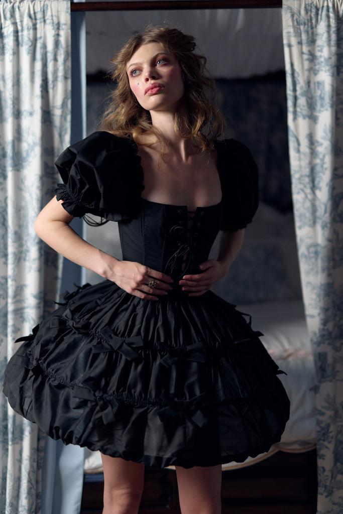 This macabre, miniature Marie Antoinette structured hoop skirt evokes the elegance of the 18th-century French court, updated for the modern vampiress. Crafted from poly organdy as delicate as a bat's wing and accented with Raven black bows, this is an utterly beguiling accompaniment to any dress or skirt.