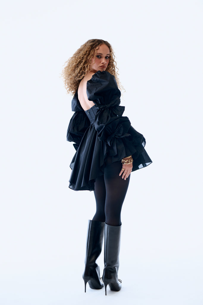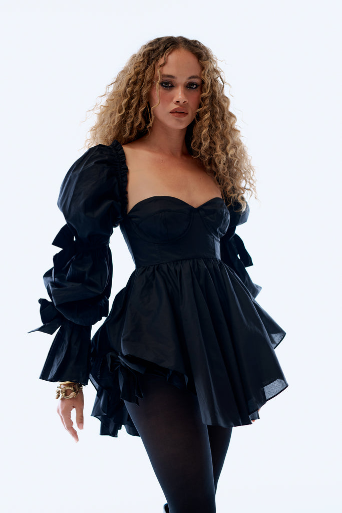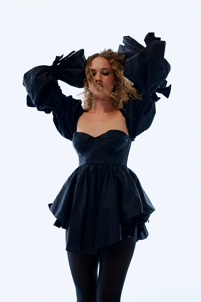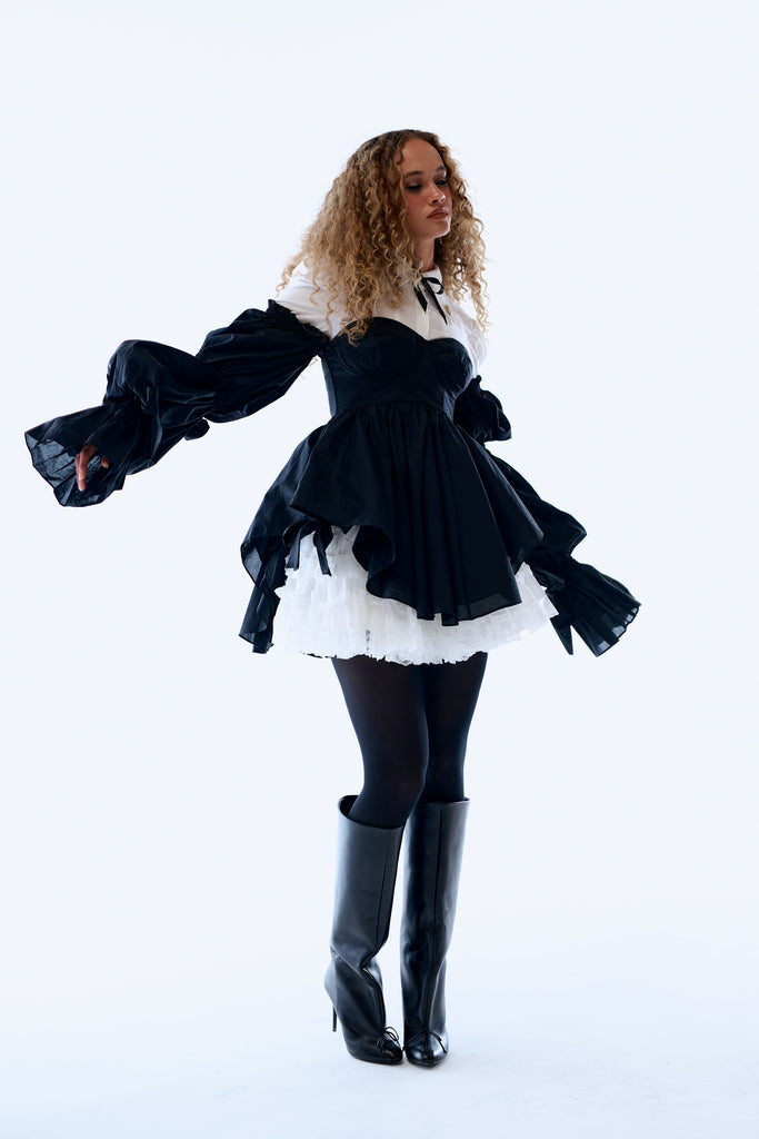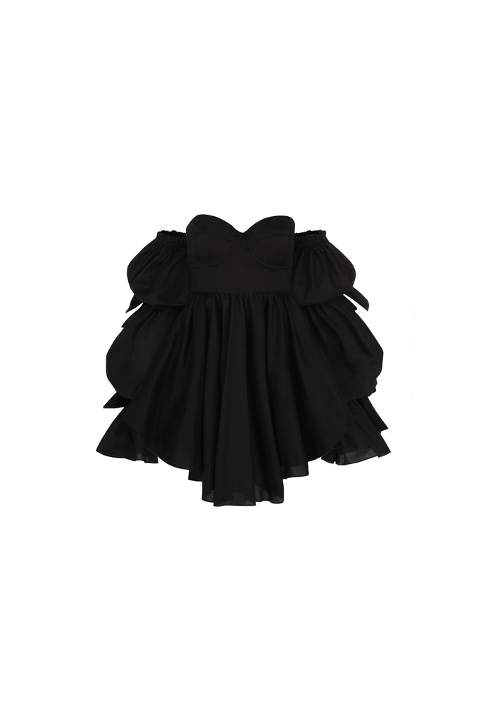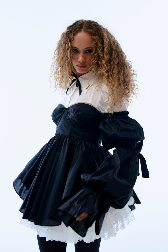 This cotton mini dress, with its off-the-shoulder bubble sleeves and high-low pleated skirt, will turn heads through the centuries. The bow cinch details, adorned with adjustable ties down the sleeves, add a touch of vampiric charm, while the underwire cups provide a structured silhouette.