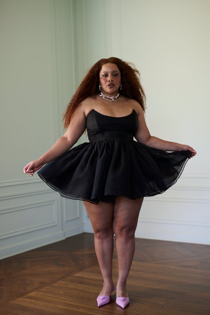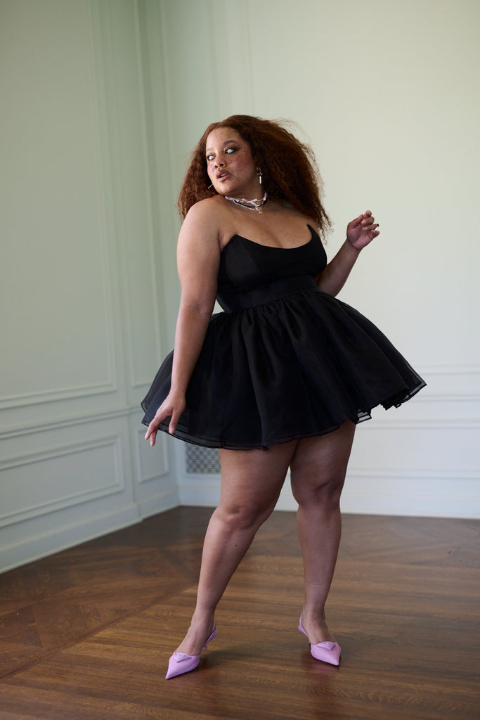 This mini strapless silk dress is as crisp and elegant as Veuve Clicquot—boning adds beautiful structure to the simple strapless bust, and layers of pleated silk gauze make the mini puff skirt ideal for twirling. We suggest pairing these with our Dauphine Knickers. The raven is rap rapping, and ready to wear.
