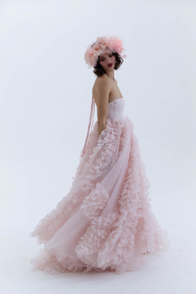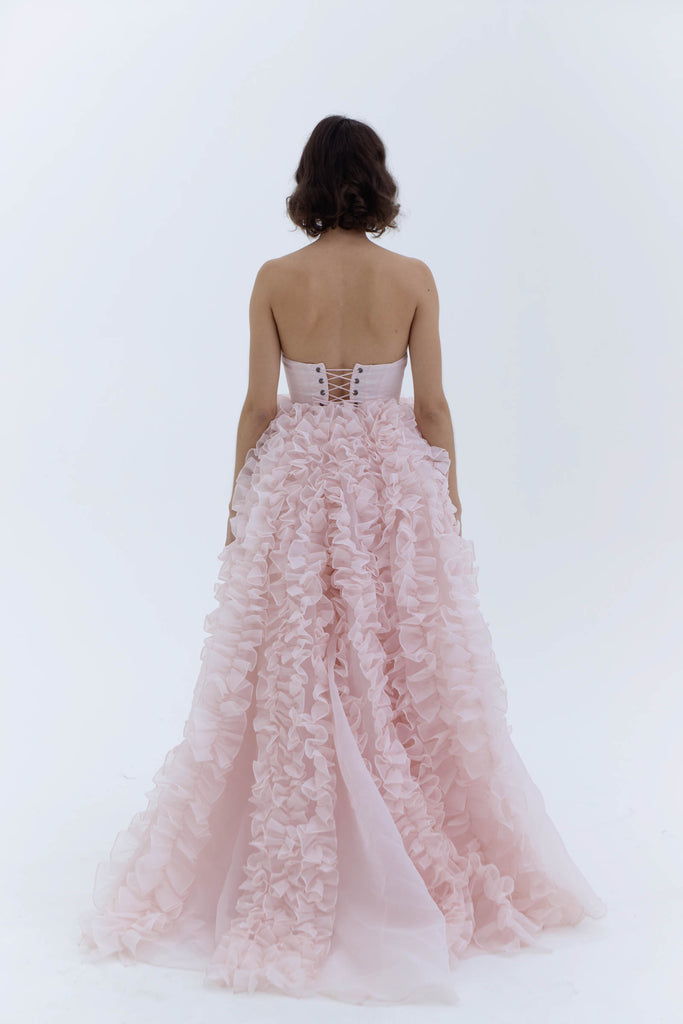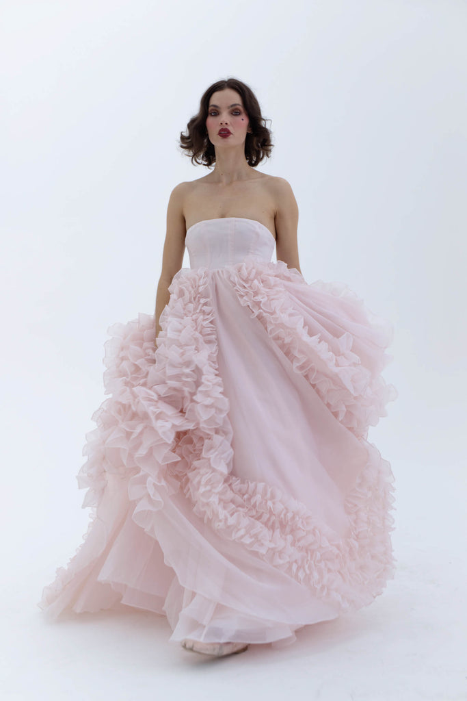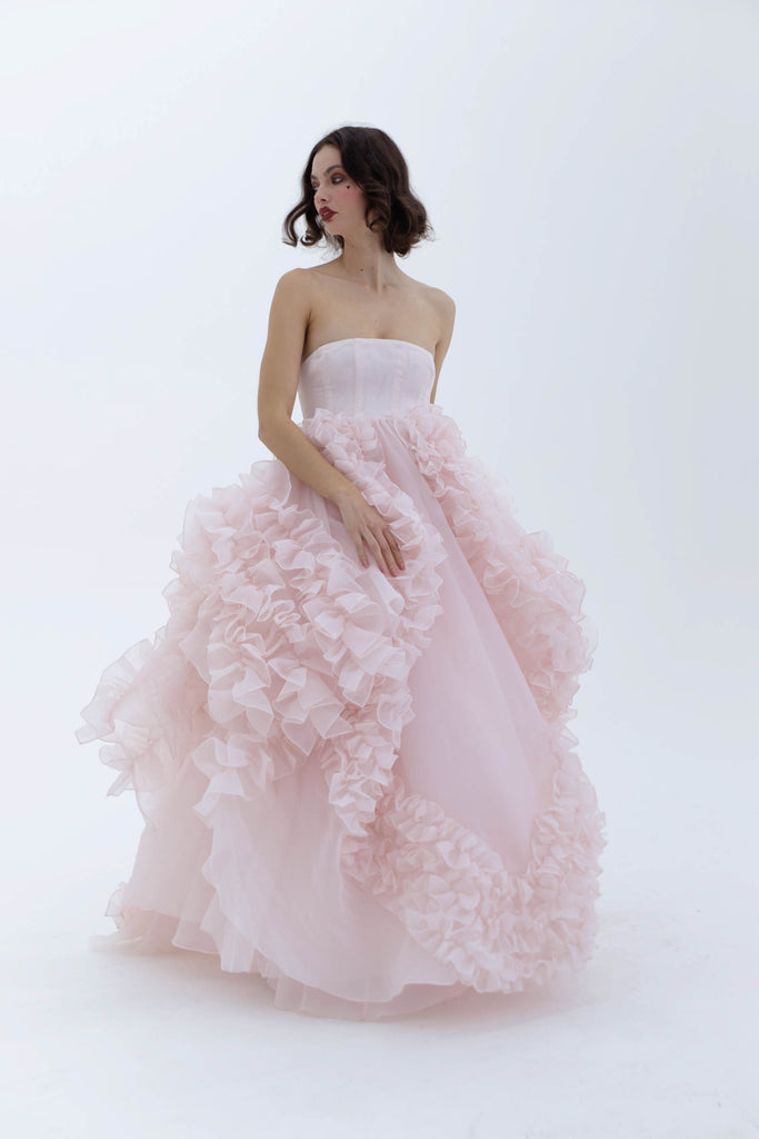 - Floor length strapless gown with voluminous ruffled skirt panels