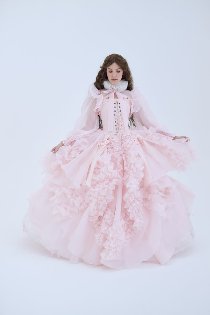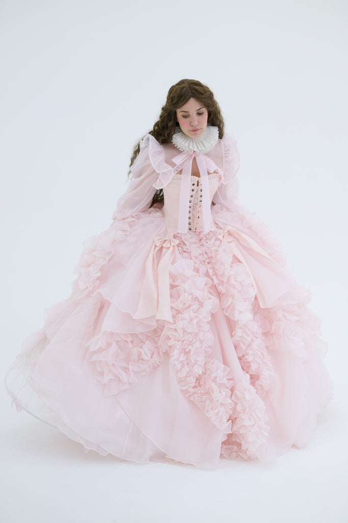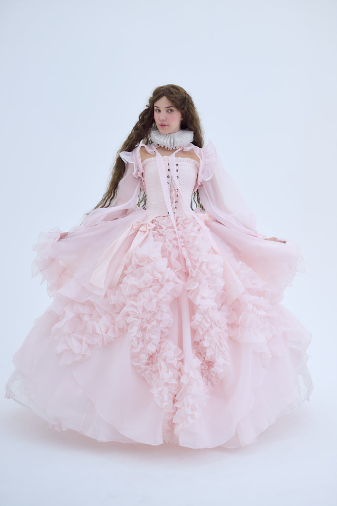 Dance beneath the twinkling stars of the Italian Riviera in this captivating strapless gown. The breathtaking skirt blooms with cascading ruffles resembling rose petals, swaying like gentle waves upon the Mediterranean Sea. With its corset closure and buttons to bustle the skirt, it's the epitome of timeless glamour.
