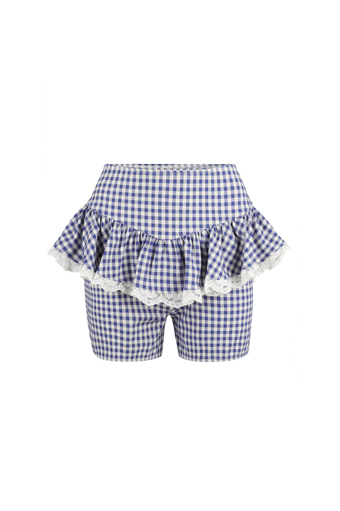 Drawing from nostalgic summertime Americana traditions, these classic blue gingham spandex shorts feature an attached ruffle tutu with contrast cotton lace trim.