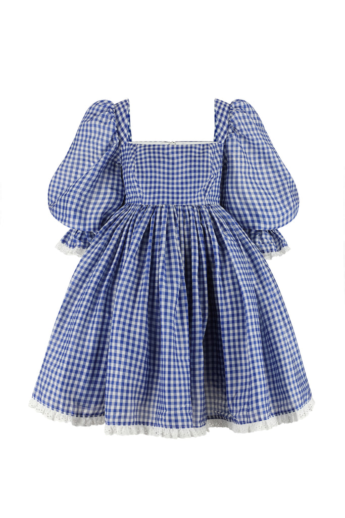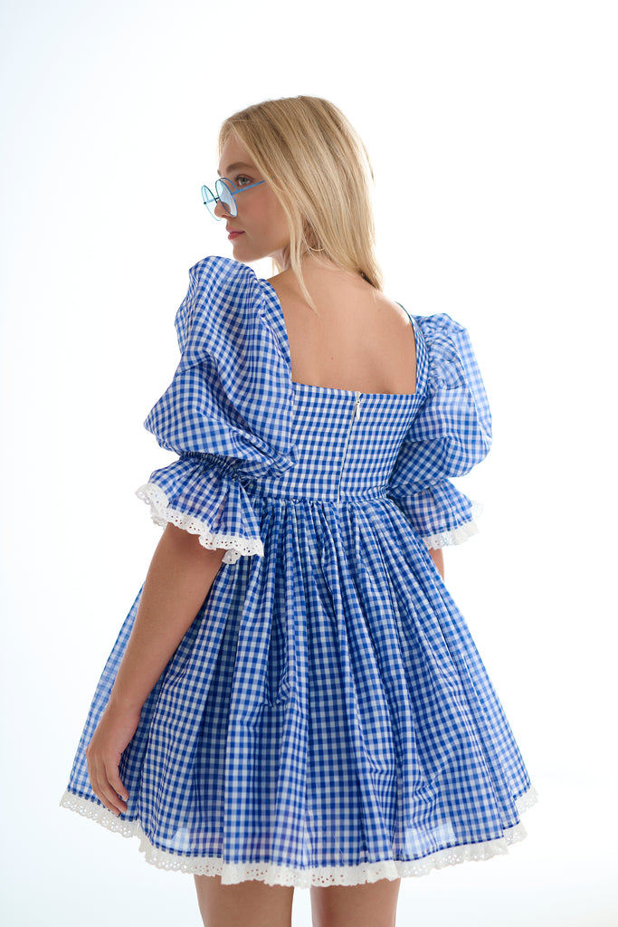Drawing from nostalgic summertime Americana traditions, this classic blue gingham, empire waist mini dress features puff sleeves and contrast cotton lace trim.