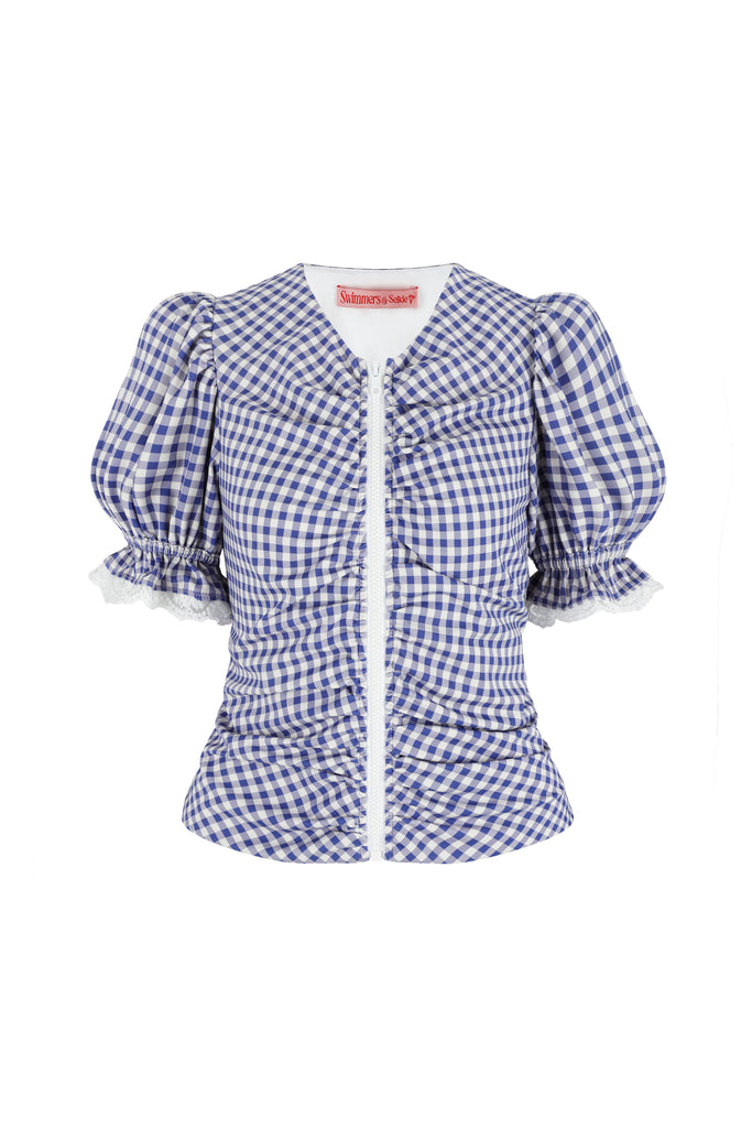 Drawing from nostalgic summertime Americana traditions, this classic blue gingham spandex swim top features puff sleeves and contrast cotton lace trim. The front zip with shirring detail creates a sweetly structured silhouette.