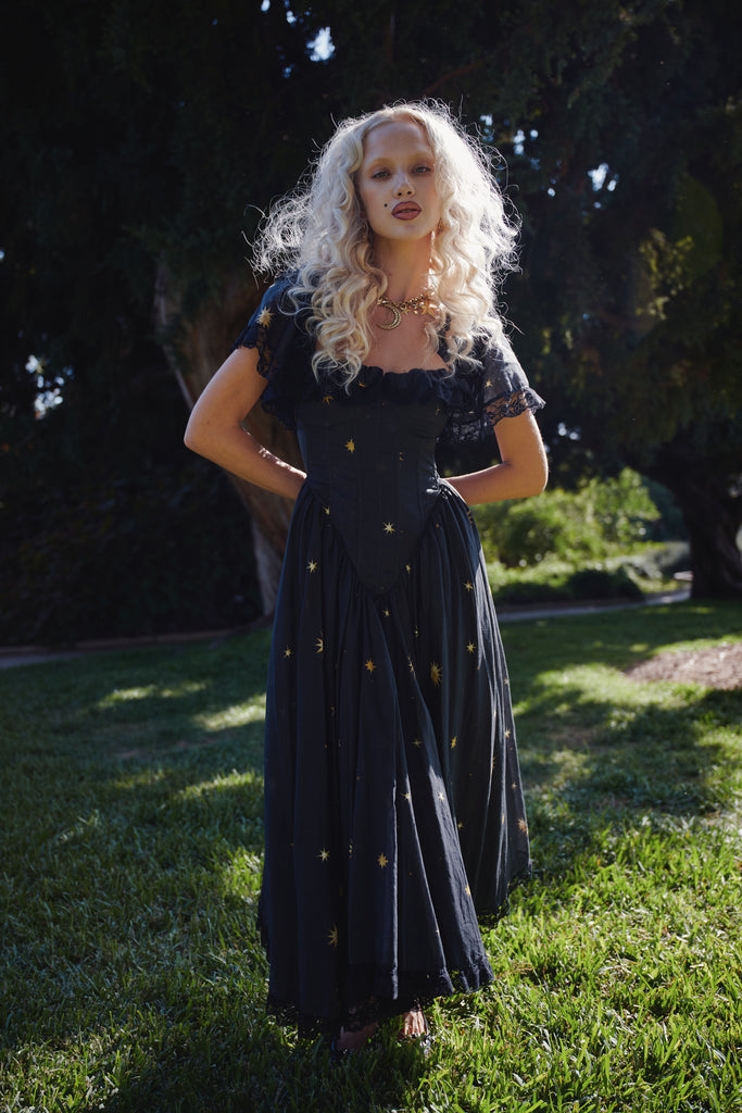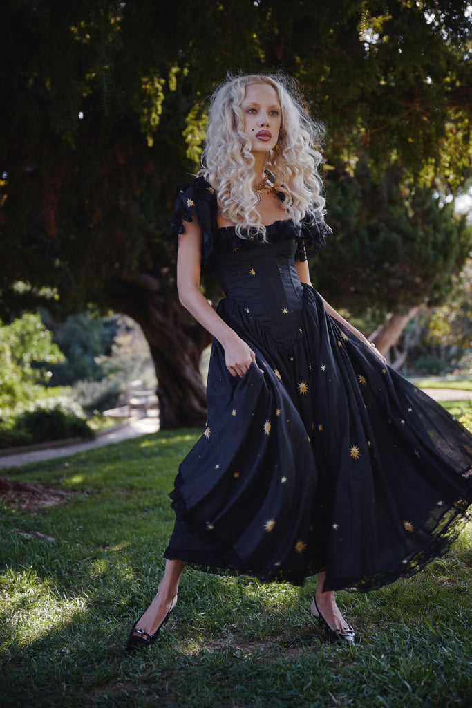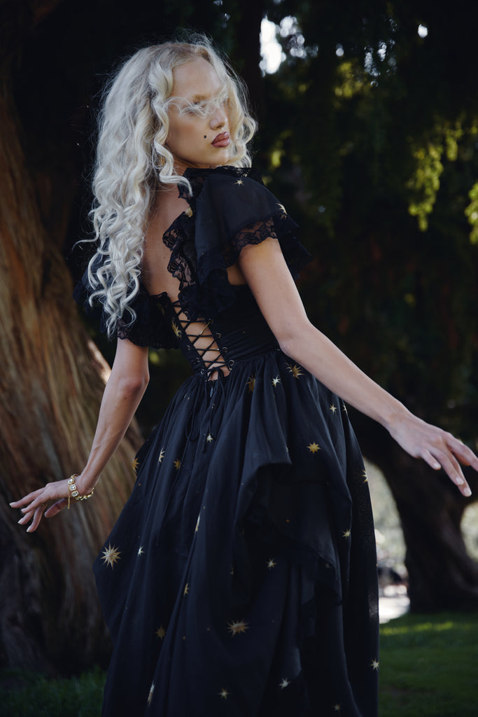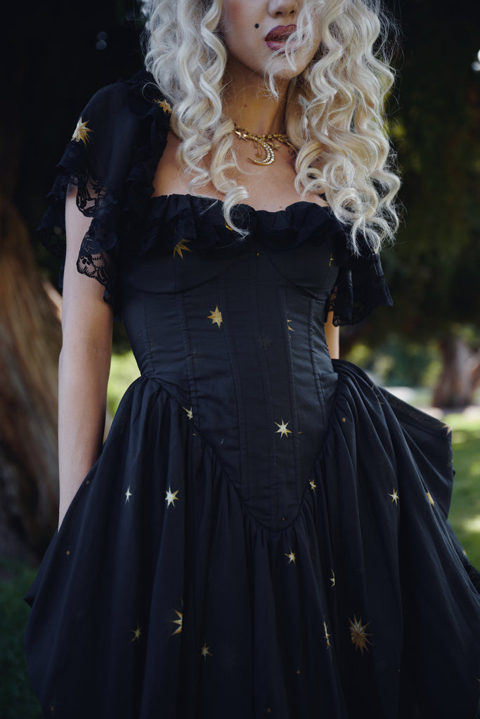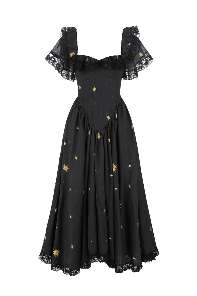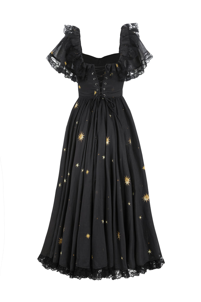 Drawn from a saint's cape depicted in historical artwork, golden star motifs adorn this cotton gauze Basque waist corset midi. Underwire cups and boning at the waist create divine structure while side bustling, corset lacing at the back, and lace trim throughout weave together an enchanting silhouette of pure femininity.