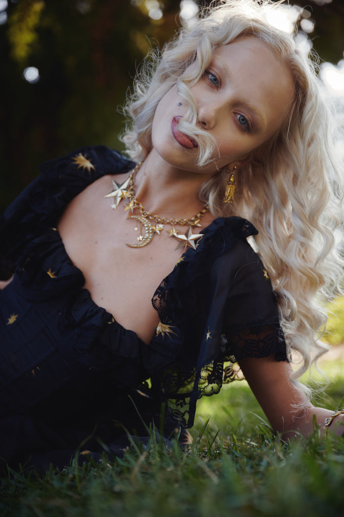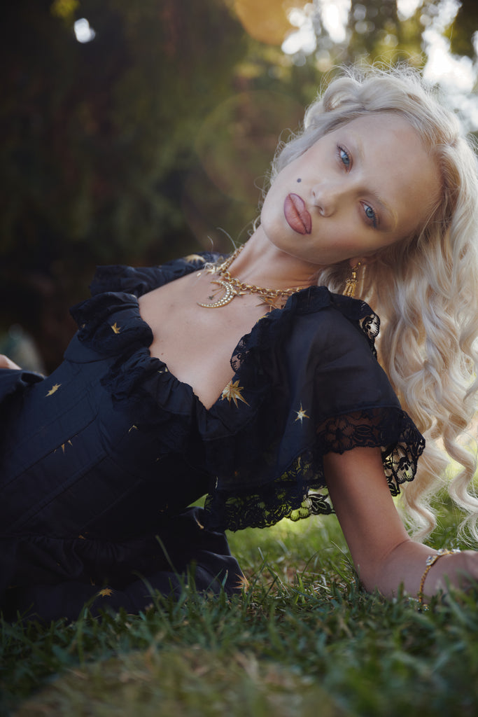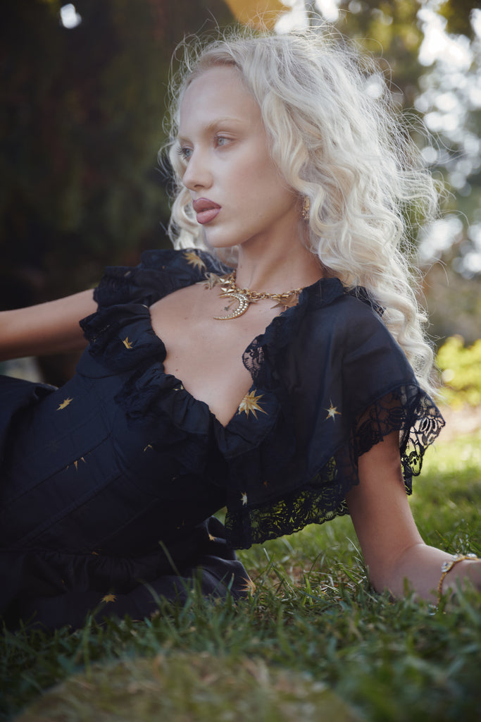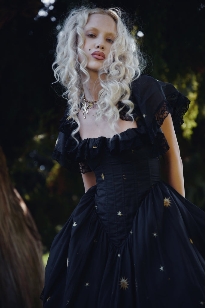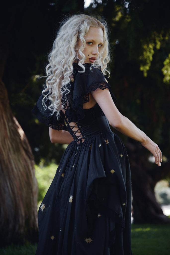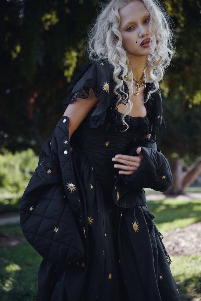 Drawn from a saint's cape depicted in historical artwork, golden star motifs adorn this cotton gauze Basque waist corset midi. Underwire cups and boning at the waist create divine structure while side bustling, corset lacing at the back, and lace trim throughout weave together an enchanting silhouette of pure femininity.