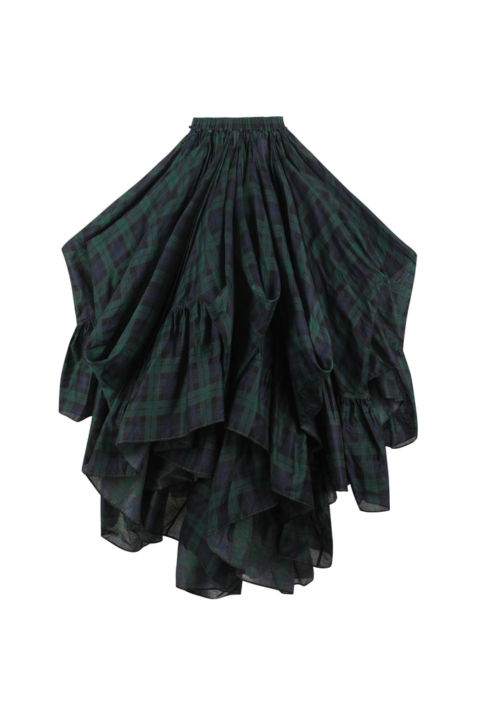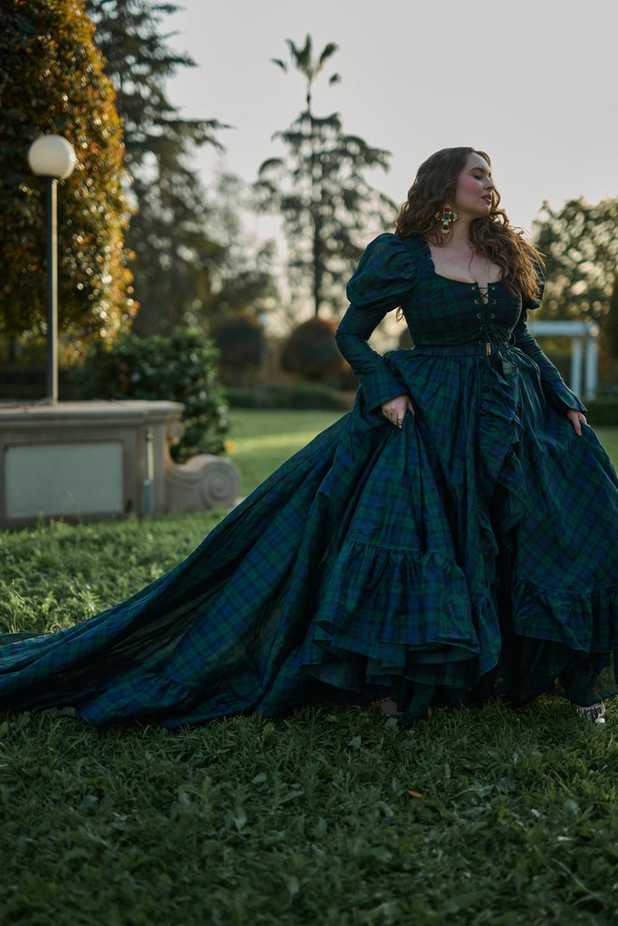 Drawing from Selkie founder Kimberley Gordon's Scottish heritage, this Duchess Tournure transforms the traditional Scotland Plaid into something truly magical. This luxury skirt topper fastens easily at your waist, creating instant gown moments without the full investment of a formal dress. The floor-sweeping, open-front design, lavished with ruffles and a sweeping train, turns any dress into an extravagant ensemble that echoes with Highland romance.