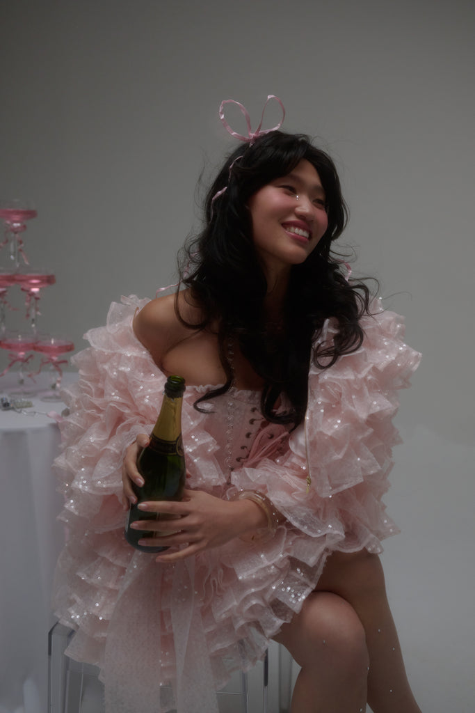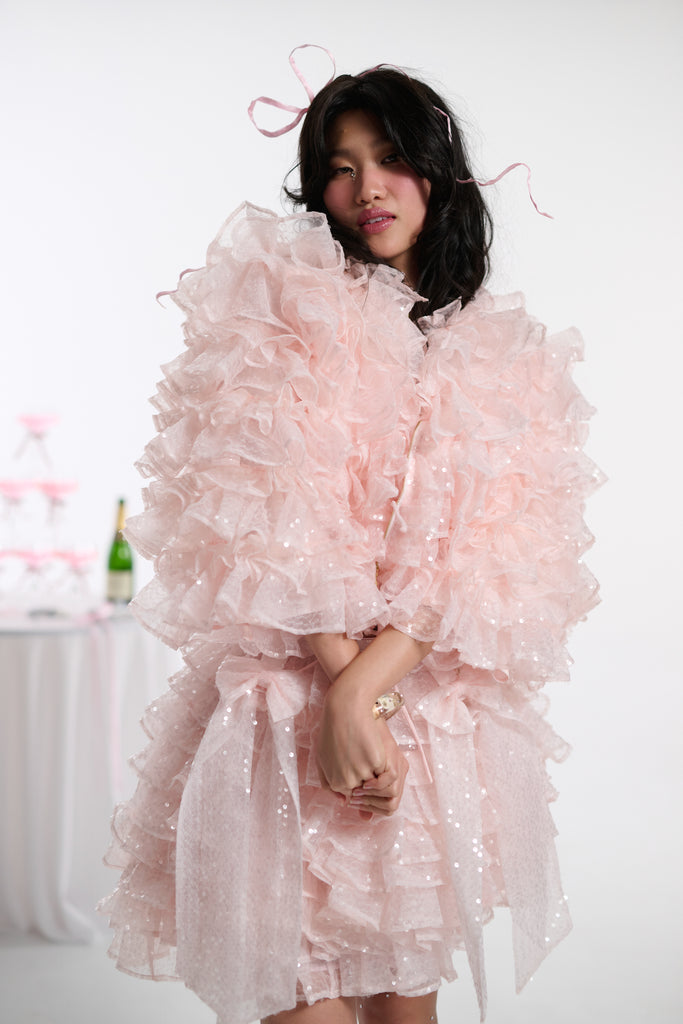 Le Petit Chou Jacket is a cascade of ruffles that mimic the effect of a celebratory boa. In shimmering blush sequins, it's the perfect finishing touch for dancing on tables or turning everyday moments into celebrations. A delight on the body and utterly Selkie, this unique piece lights up every room, glistening like sugar crystals floating atop rosé bubbles.