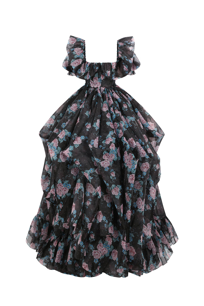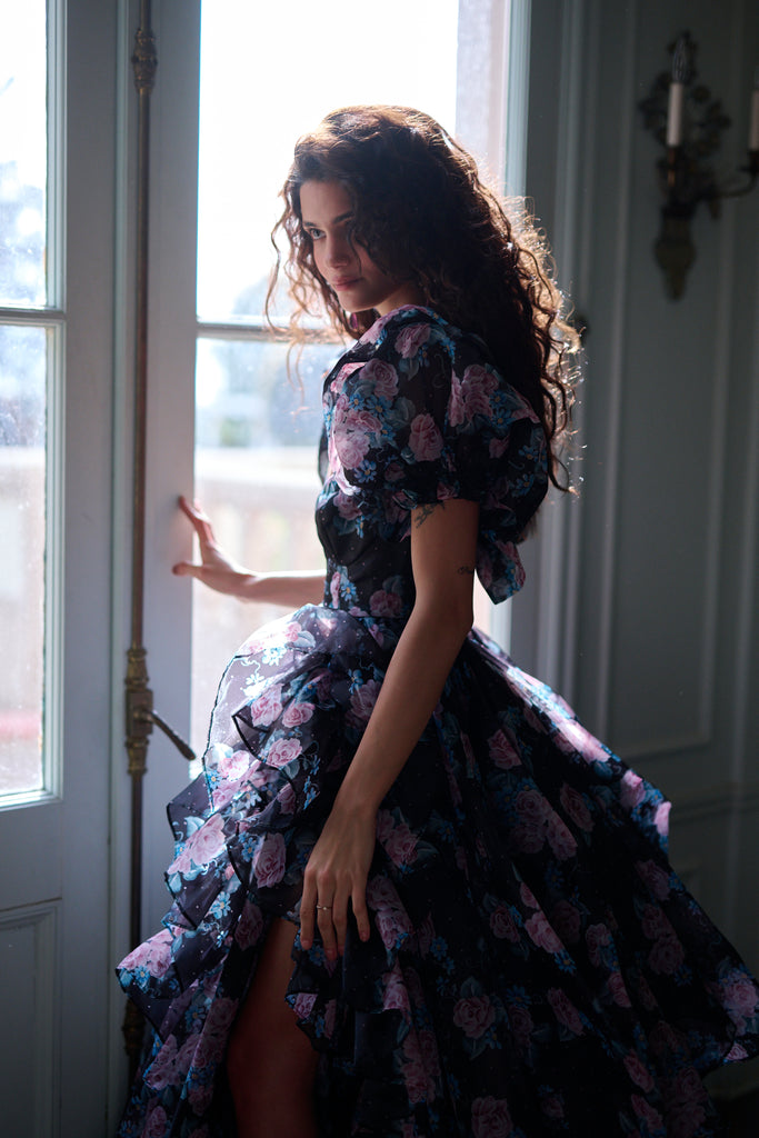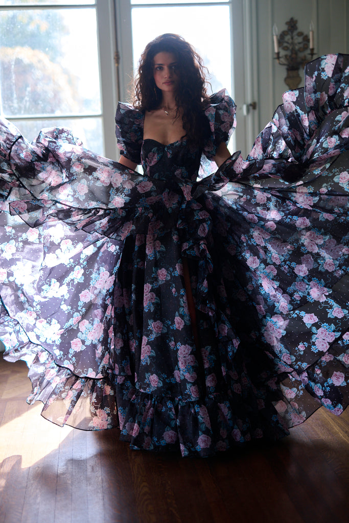 This is a gown fit for a rather *provocative*, mystical enchantress, featuring a liberally drawn ruffled leg slit, and layers and layers of voluminous skirt. Shoulder ruffles at the sleeve and underwire cups highlight the bust while the devastatingly dramatic skirt—which can be worn bustled up for a bouffant effect or down for a seriously glamorous train—is the standout feature of this spellbinding gown.