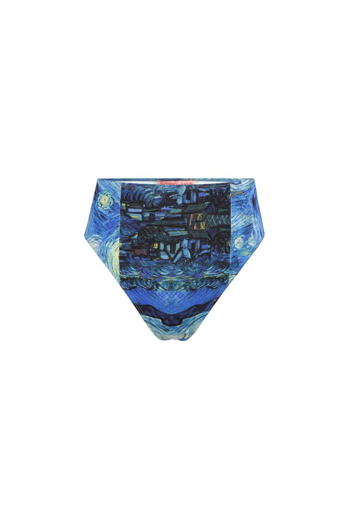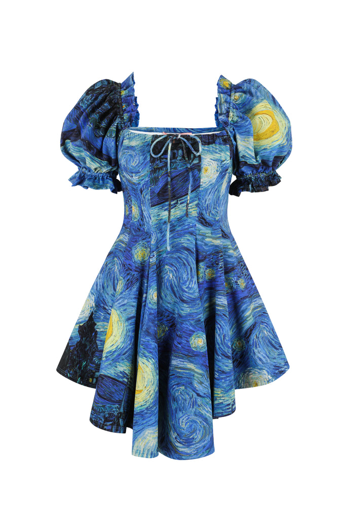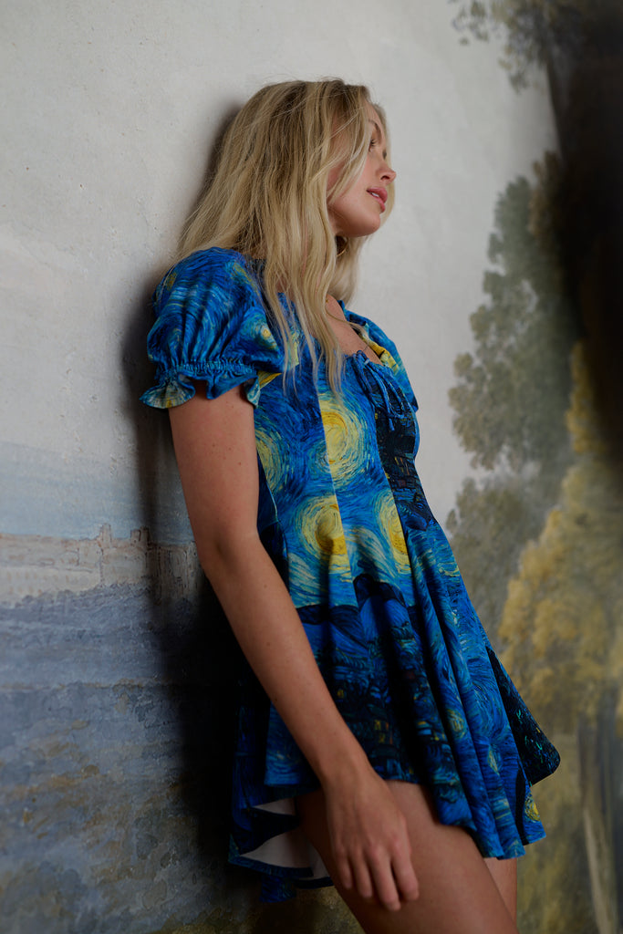 This spandex swim dress features puff sleeves and ruffle detail with an adjustable bust tie, while curve-hugging princess seams and invisible zipper closure trace a feminine silhouette. Complete with high cut swim bottoms in a flattering mid waist design. Inspired by Van Gogh’s most famous painting, the Starry Night print is a universal reminder of the divine. And of imagination—blurring the lines between dreams and reality.