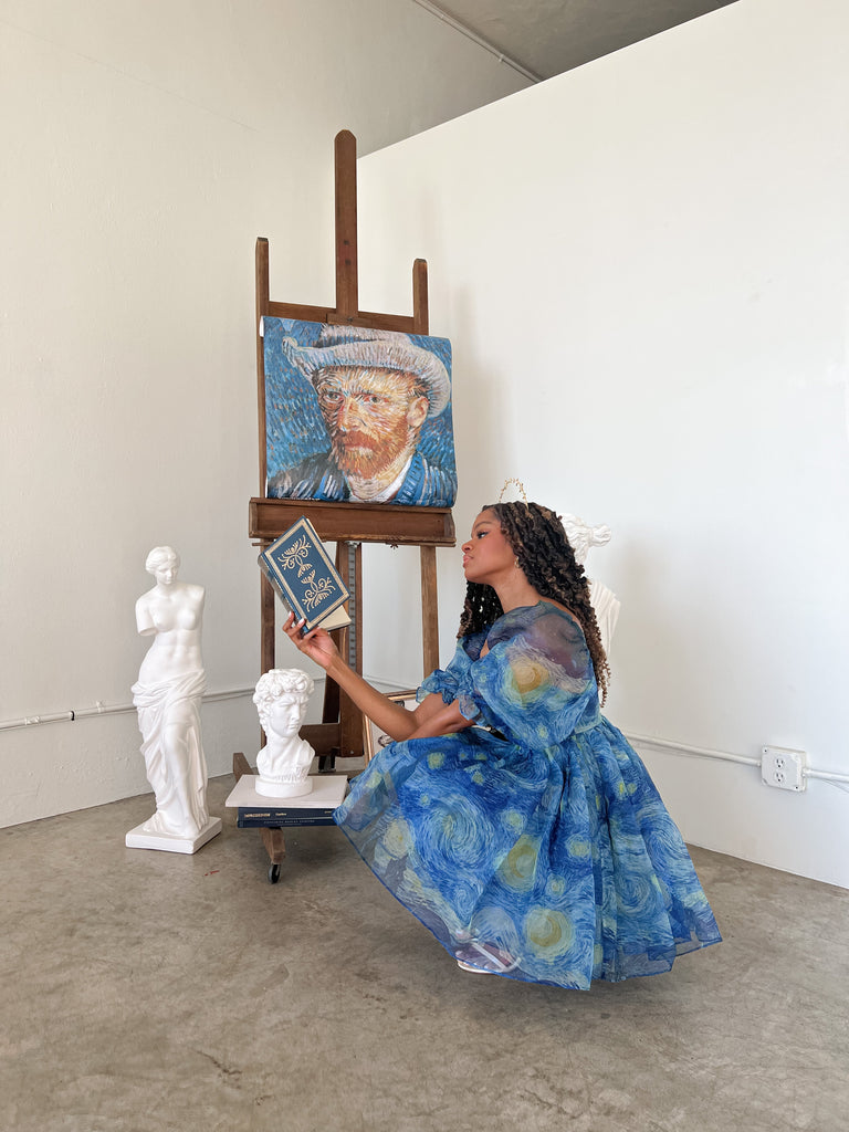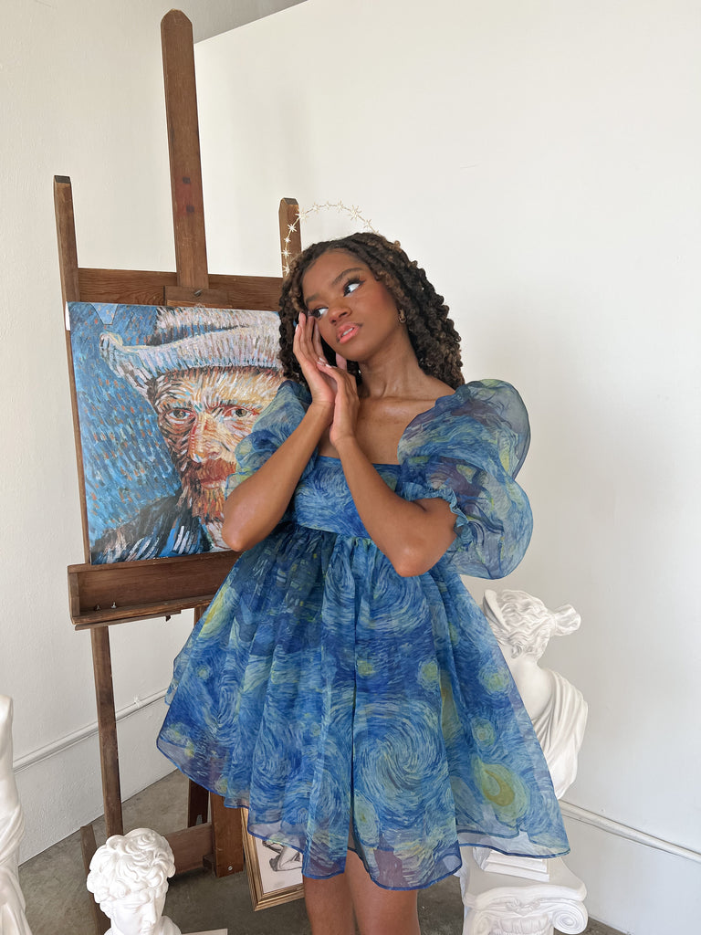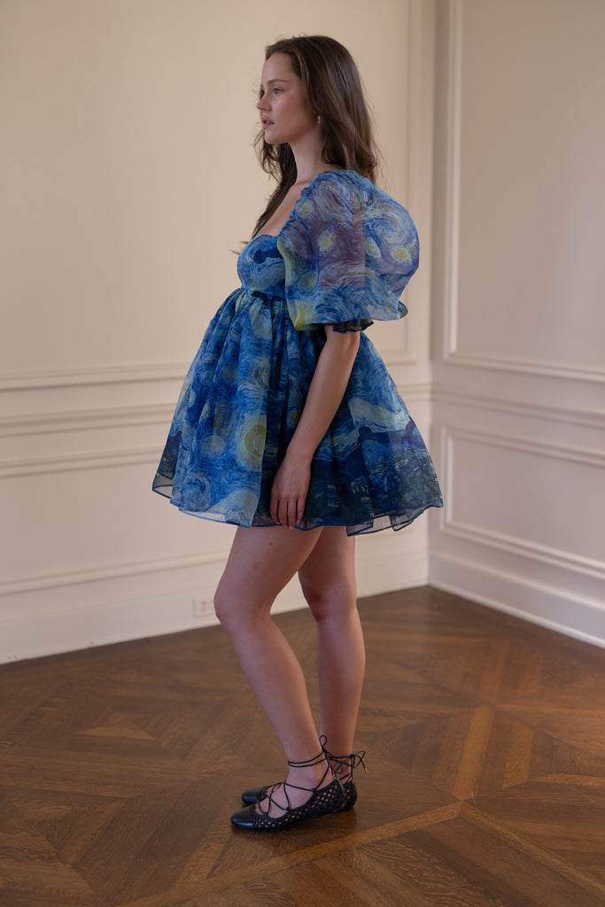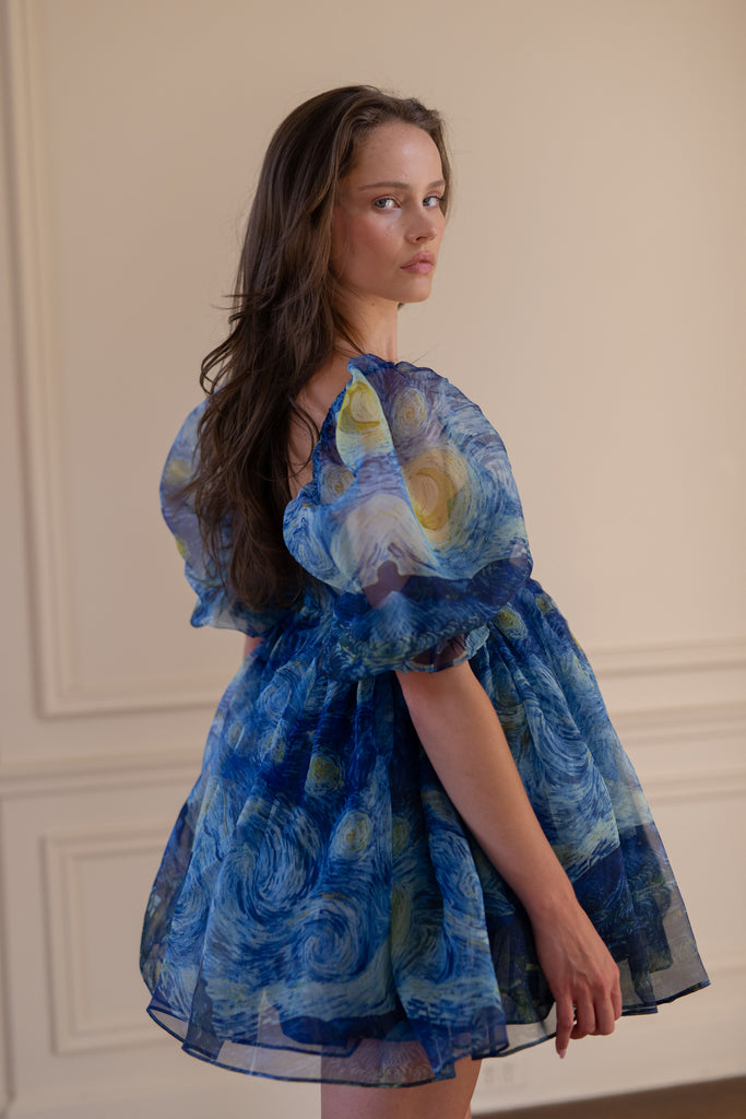 Van Gogh’s Starry Night dances delicately across the contours of this Silk Gauze Puff Dress. Hypnotic and vibrantly blue, with sheer, 100% biodegradable silk, this dress beautifully imitates and embraces all the enchantment of life. From a walk along rainy spring cobblestone sidewalks to summer star-gazing under the full moon, the Starry Night Puff is ready for whatever adventure you have in store.