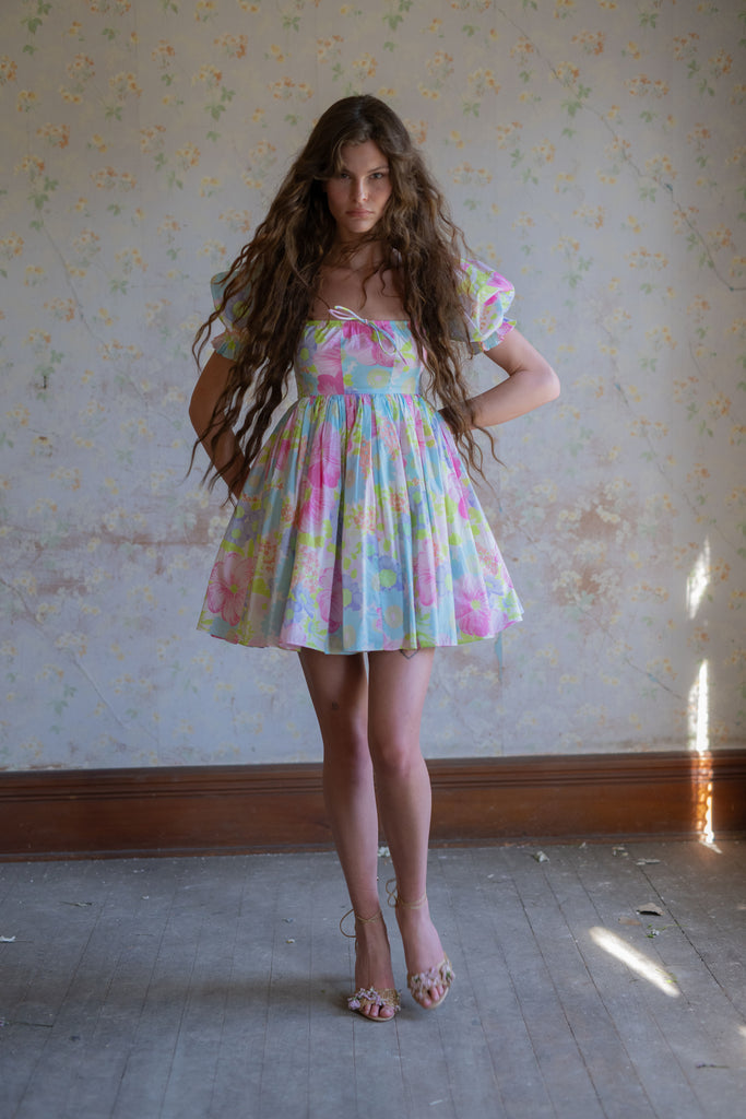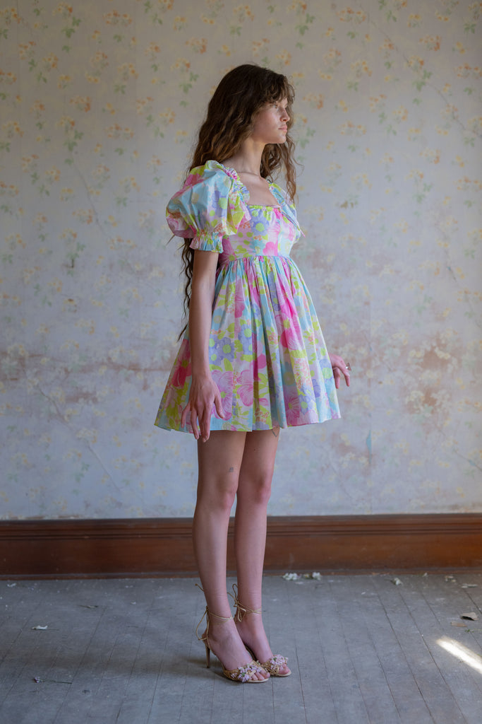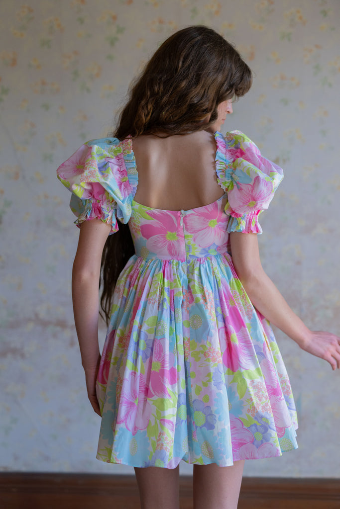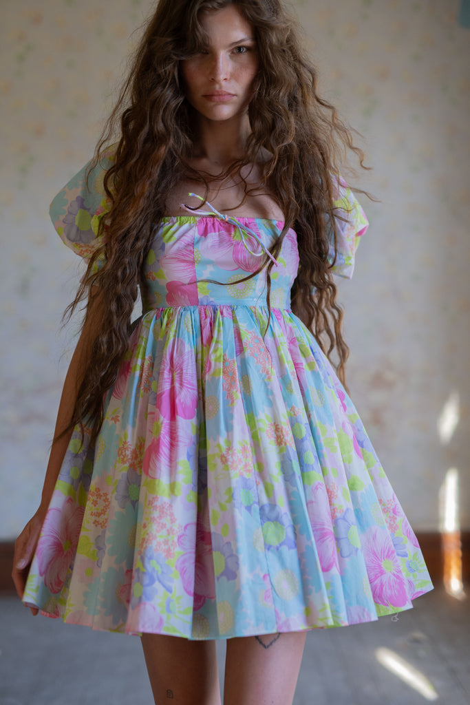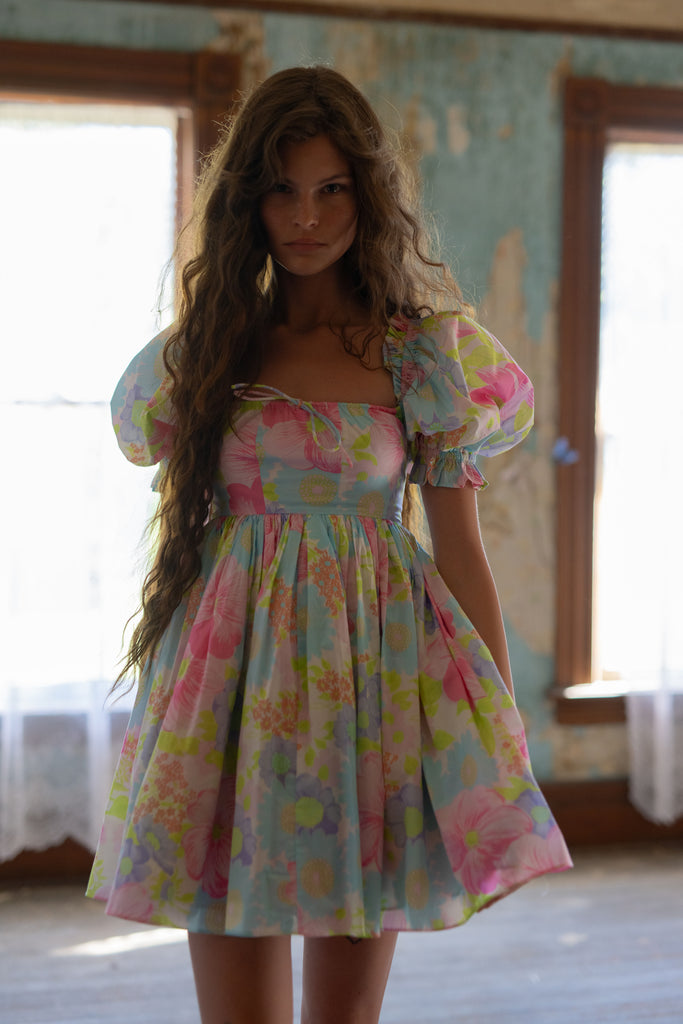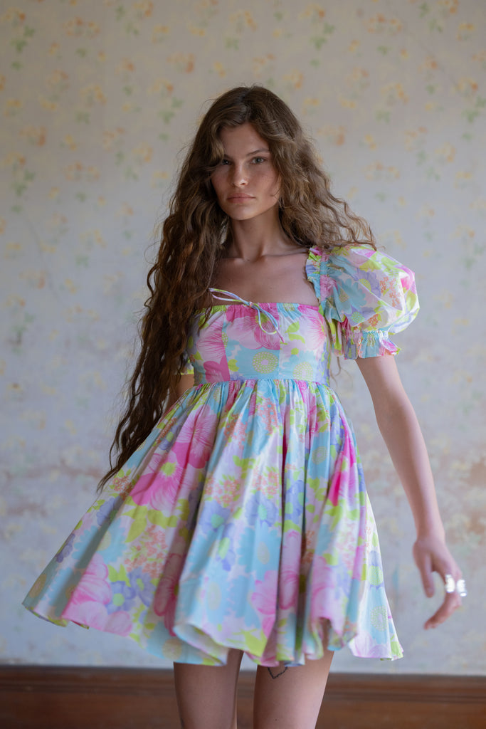 “Like the summer sunshine, pour your sweetness over,” in the Sugar Sugar Beach Day Dress – set against a soft blue canvas, exuberant pink, purple, and green blossoms intertwine in a kaleidoscope of larger-than-life florals reminiscent of a 1960s hippie haven.