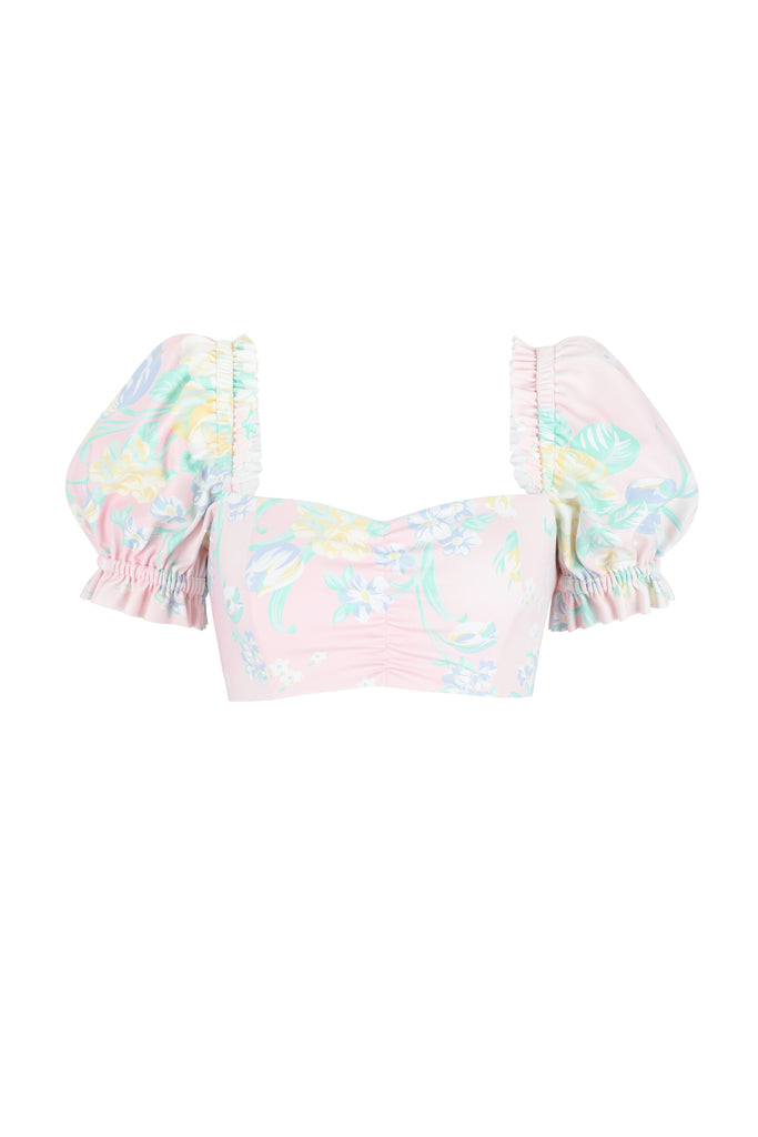 Epitomize suburban poolside panache with the Babydoll Bikini Top. This stretchy bandeau-style swim top, adorned with Selkie's signature puff sleeves, features The Sunshine Daydream, featuring hippy trippy florals with tulips sourced from an obscure 70s print.