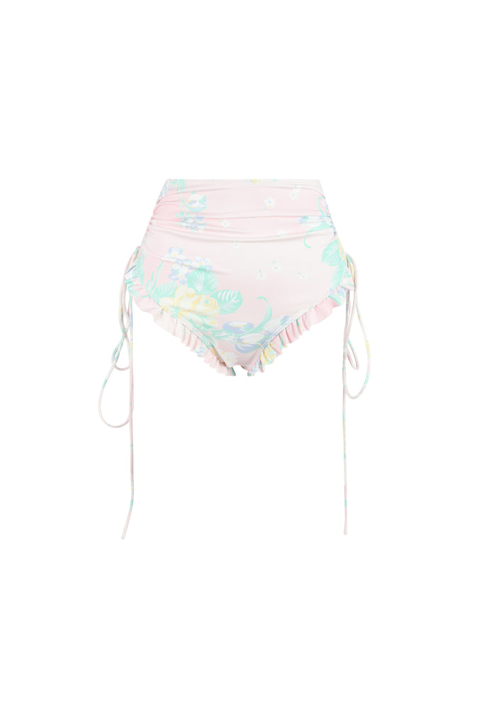 The Bardot Bikini Bottoms capture the essence of suburban poolside glamour. Honoring the style of retro icons like Twiggy and Bridget Bardot, these high-waisted stretch fabric bottoms boast adjustable drawstring ties and a playfully pleated mini ruffle detail, all in The Sunshine Daydream, featuring hippy trippy florals with tulips, sourced from an obscure 70s print.