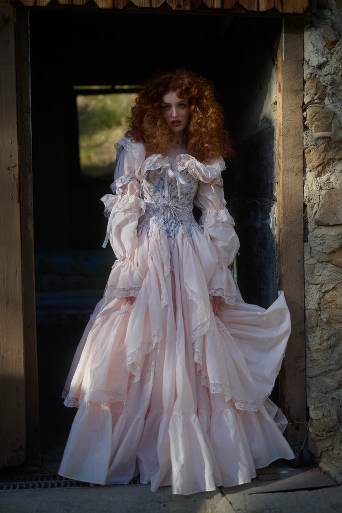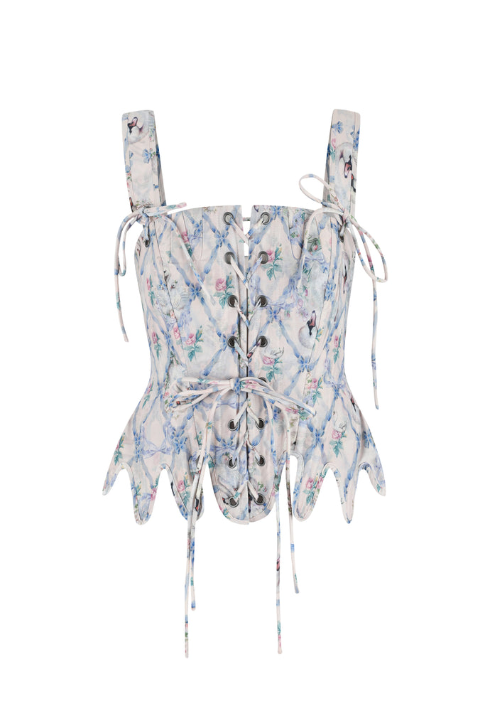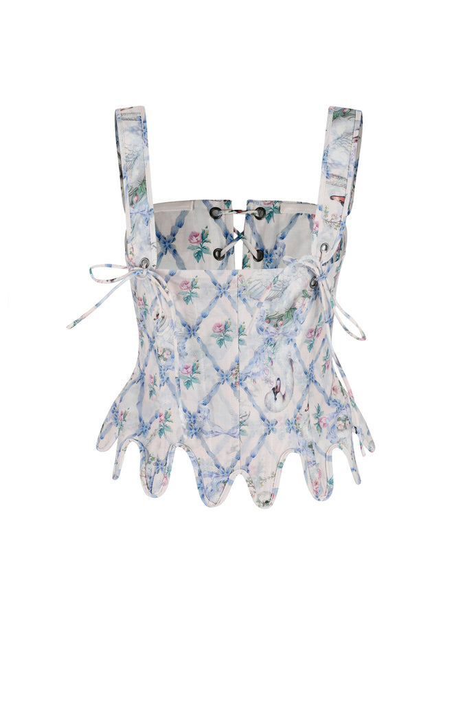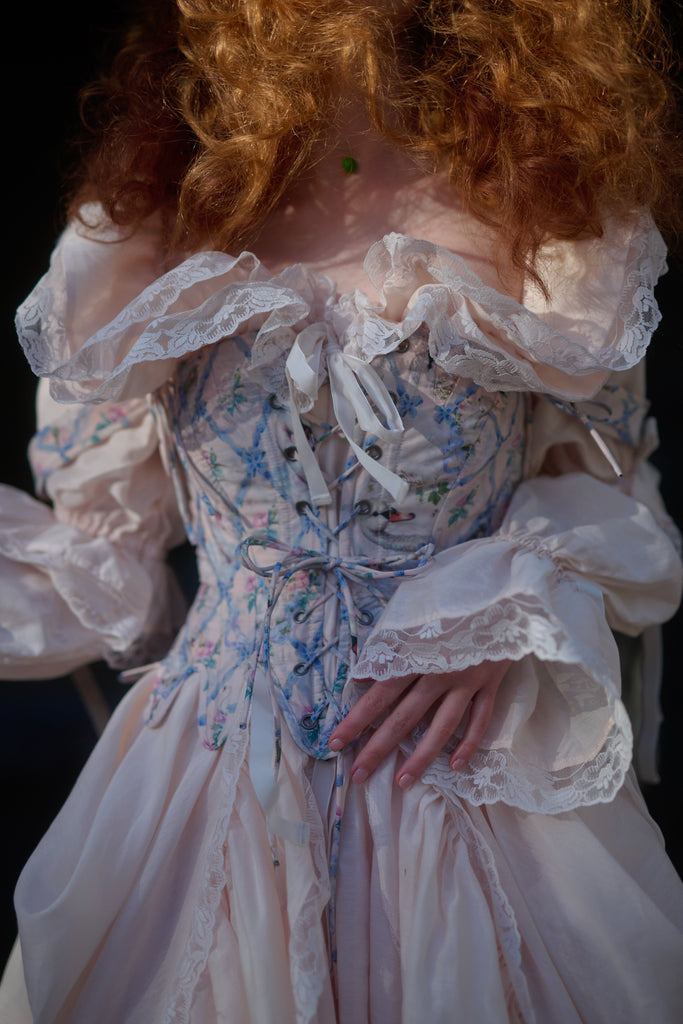 The Shipwrecked Corset in Swan Trellis evokes the haunting beauty of "The Beguiled," the Victorian-era shipwreck tale. Adorned with a beautiful blue trellis pattern with intertwining florals, this structured bodice features two draw cords for adjustable lacing and thoughtful tie straps. The distinctive jester-cut hemline adds Shakespearean flair to this late 18th-century inspired piece, while strategic boning and beautiful seam lines create an elegant silhouette. Whether worn pristine while tending to your garden or slightly undone for gathering eggs at dawn, this corset embodies the theatrical interpretation of rural life—finding beauty in simplicity and connection to the land through its storybook-inspired design.