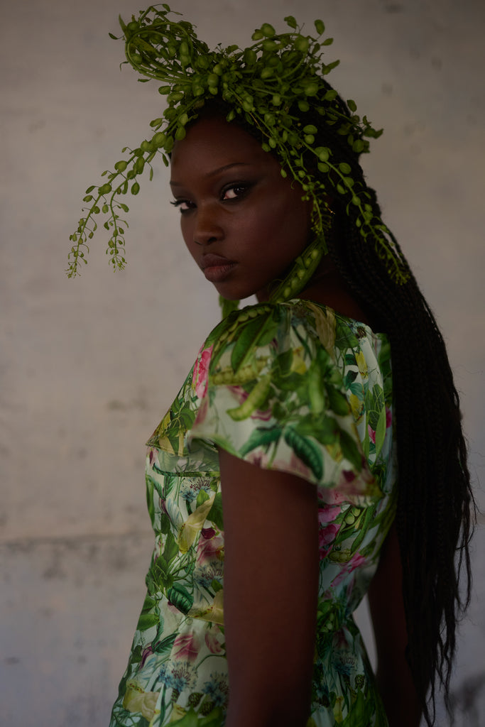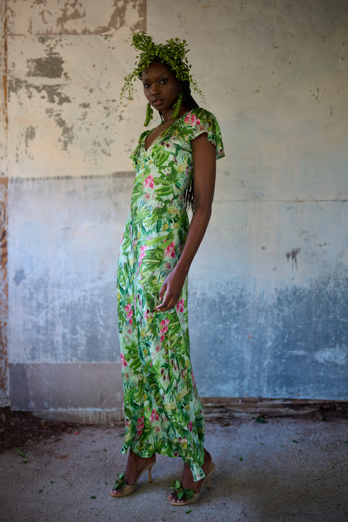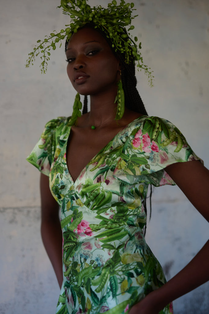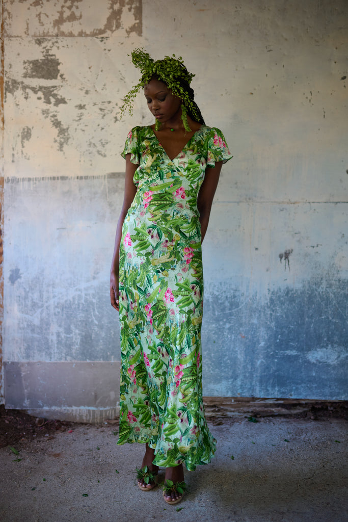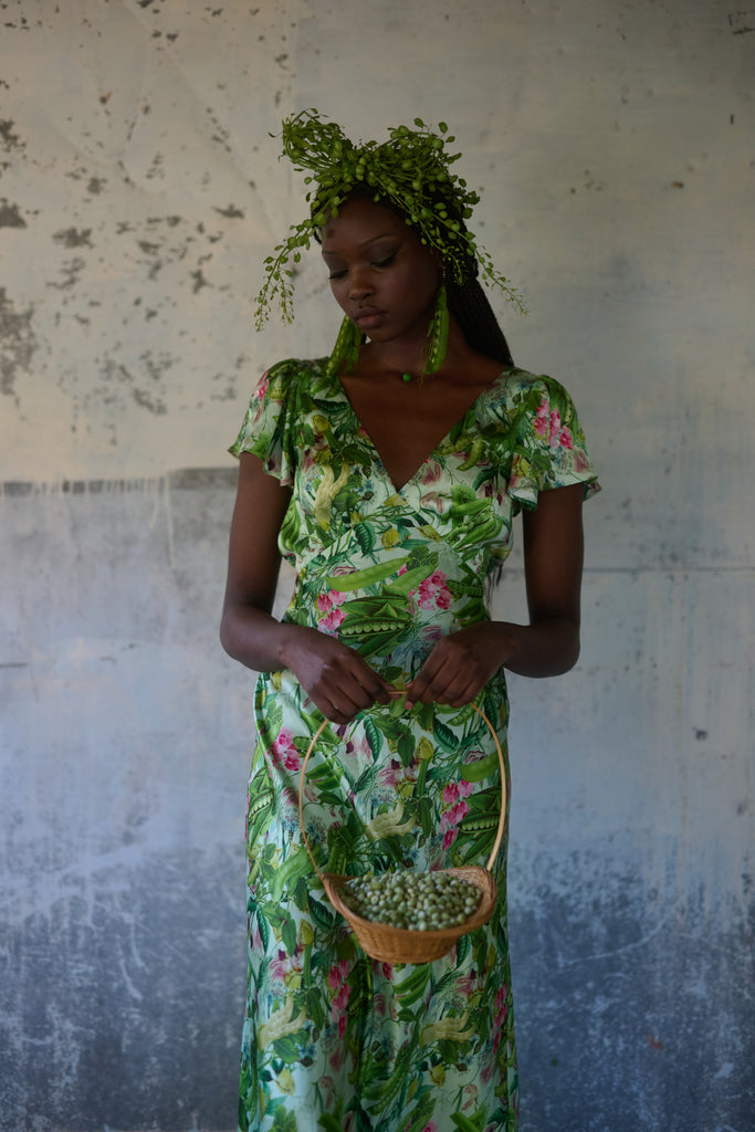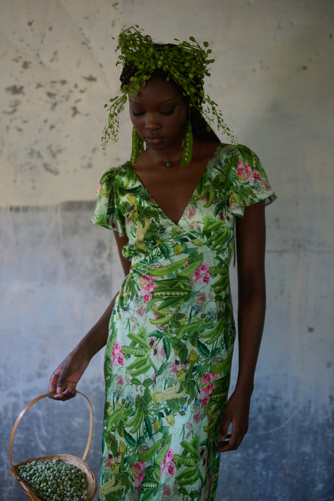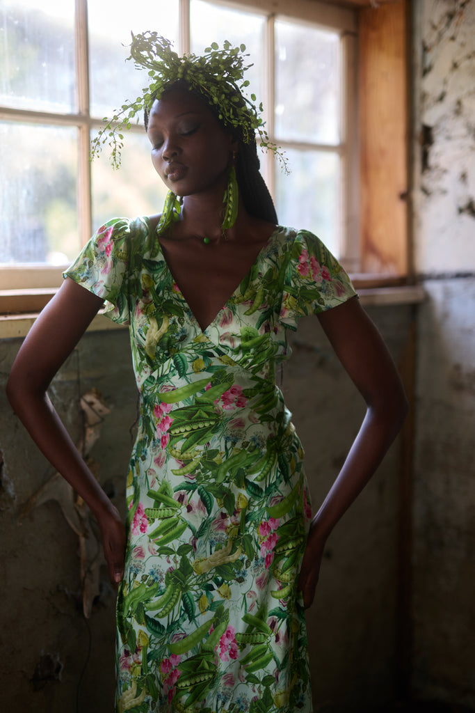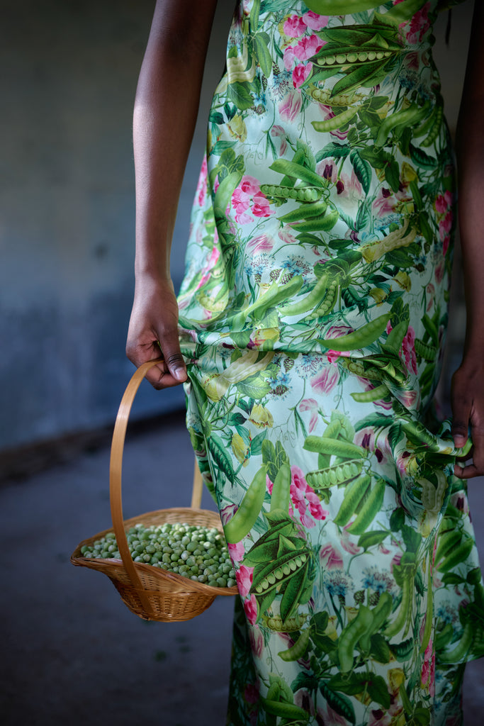 A vision in silk charmeuse, this breezy dress in an antique botanical print is cut on the bias so that the fabric drapes and stretches in a way that looks exceptional on the body. You’ll feel comfortable and taken care of thanks to double lining at the bust and tiny pleats at the back waistline for a seamless fit. Perfect for milking your cherished old cow or harvesting vegetables from your fairytale cottage garden