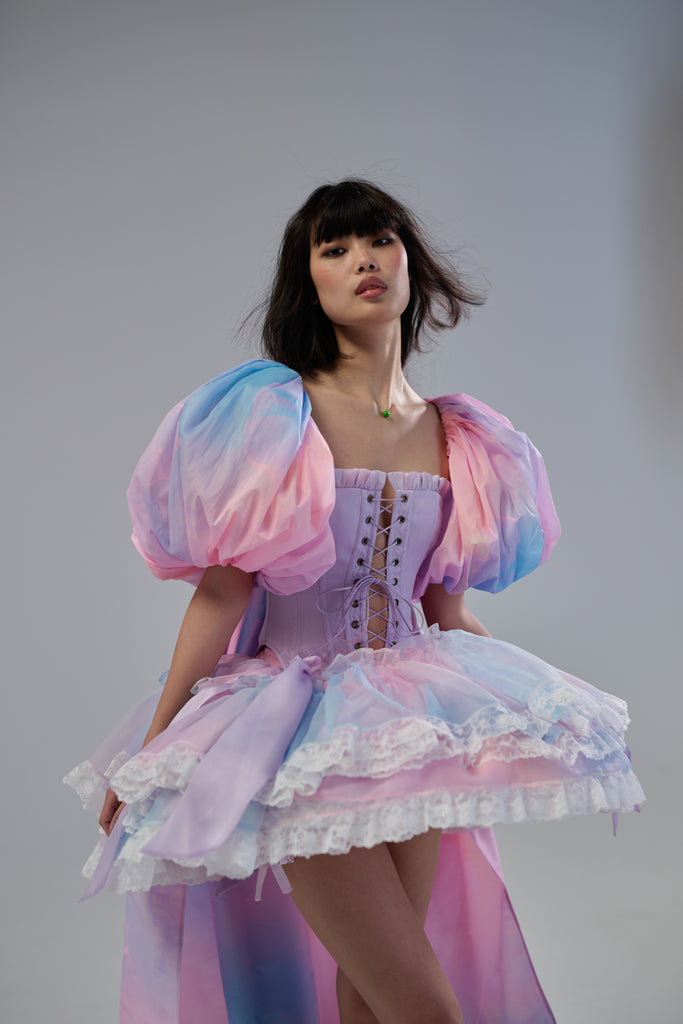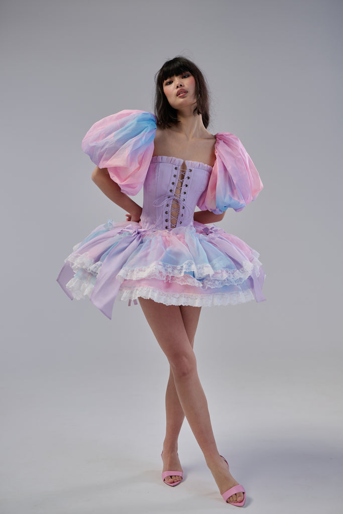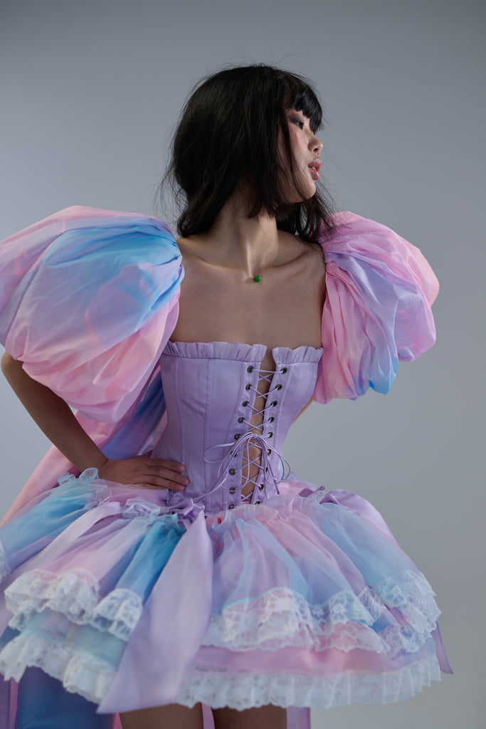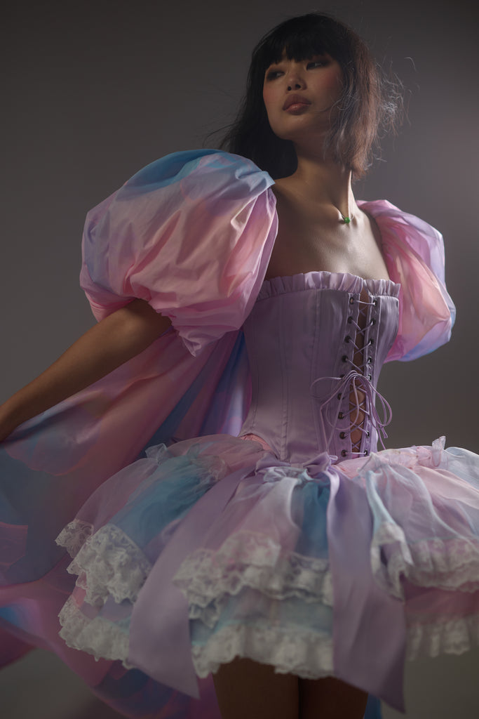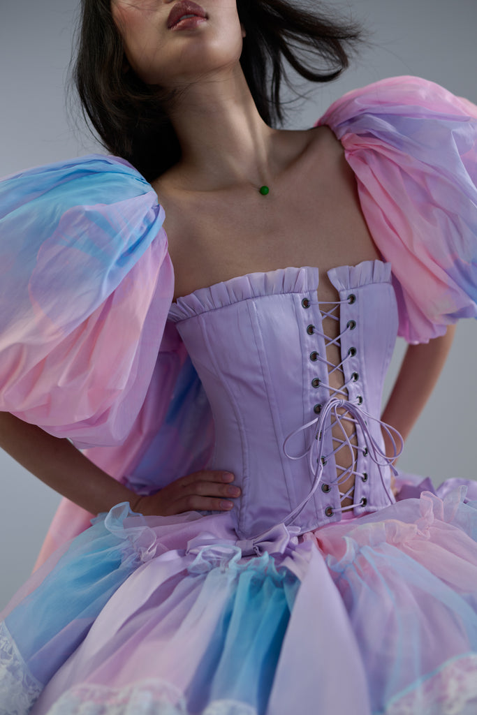Strapless and fully-boned, in a wisteria lavender hue, the A La Mode Corset is designed to make you feel ravishingly beautiful—two fully adjustable draw cords lace up the center, so you may cinch it as you please. Tiny ruffle details at the bust add additional femininity, and garter bows descend below the waist.