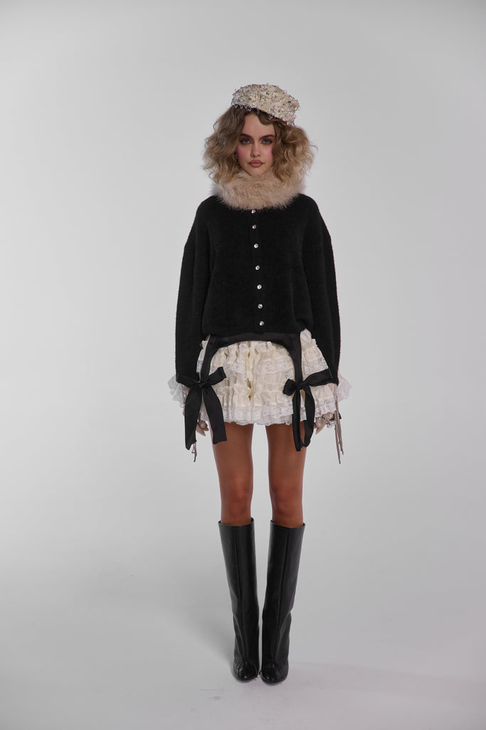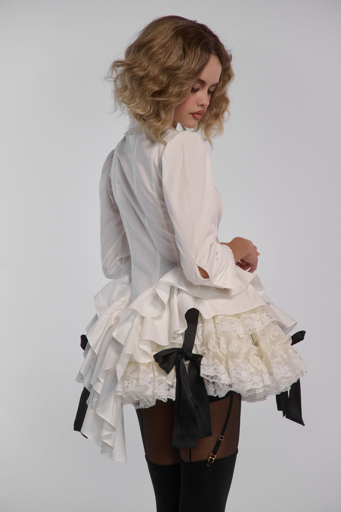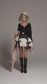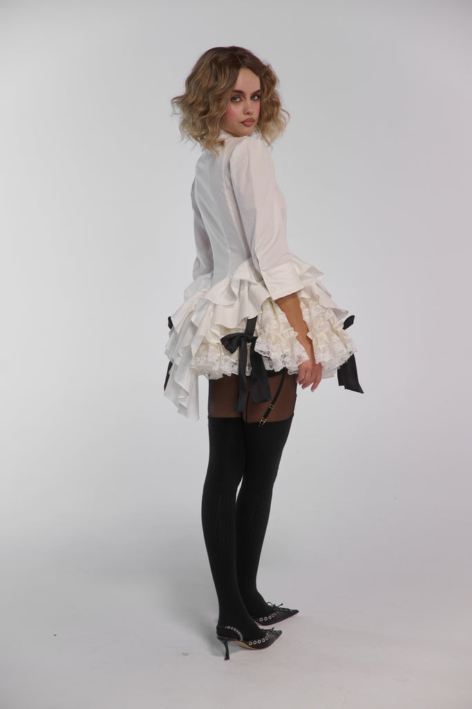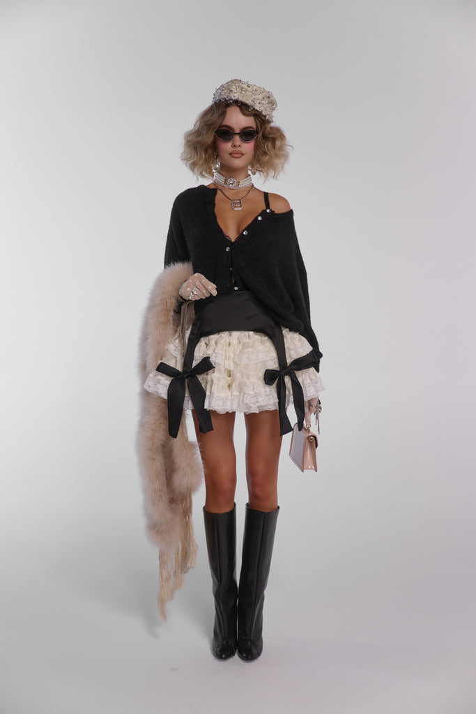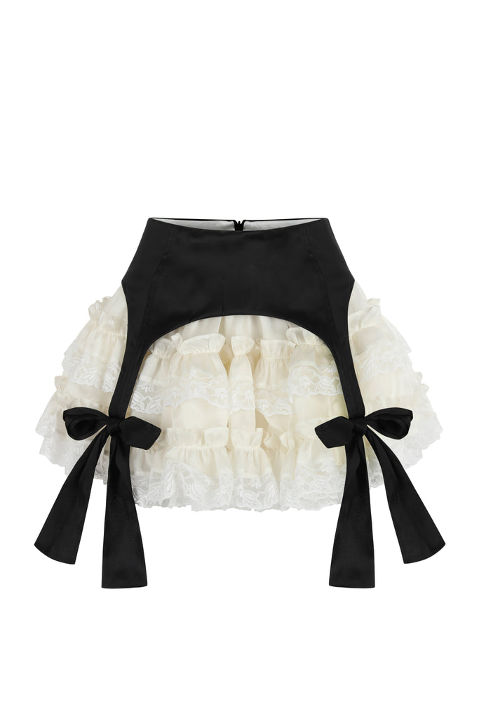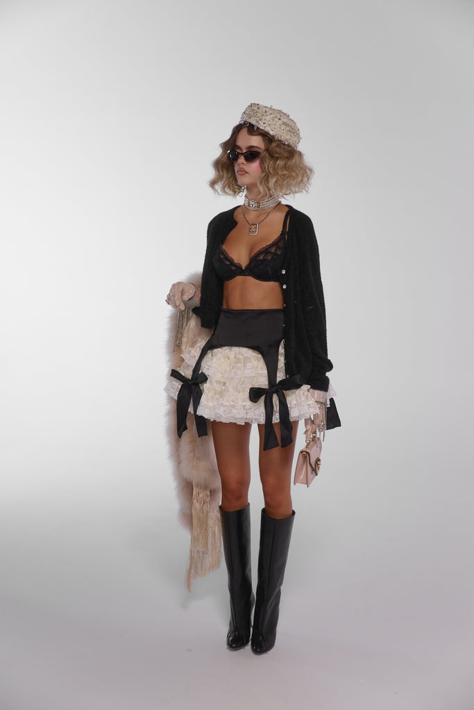 This tiered silk satin piece features rebellious little garter bows at the thigh. It’s the kind of petticoat to wear when you’re half-dressed, fully sparkling, and already late to the party. Made for girls who slip out of cabs laughing and find confetti in their hair by sunrise.