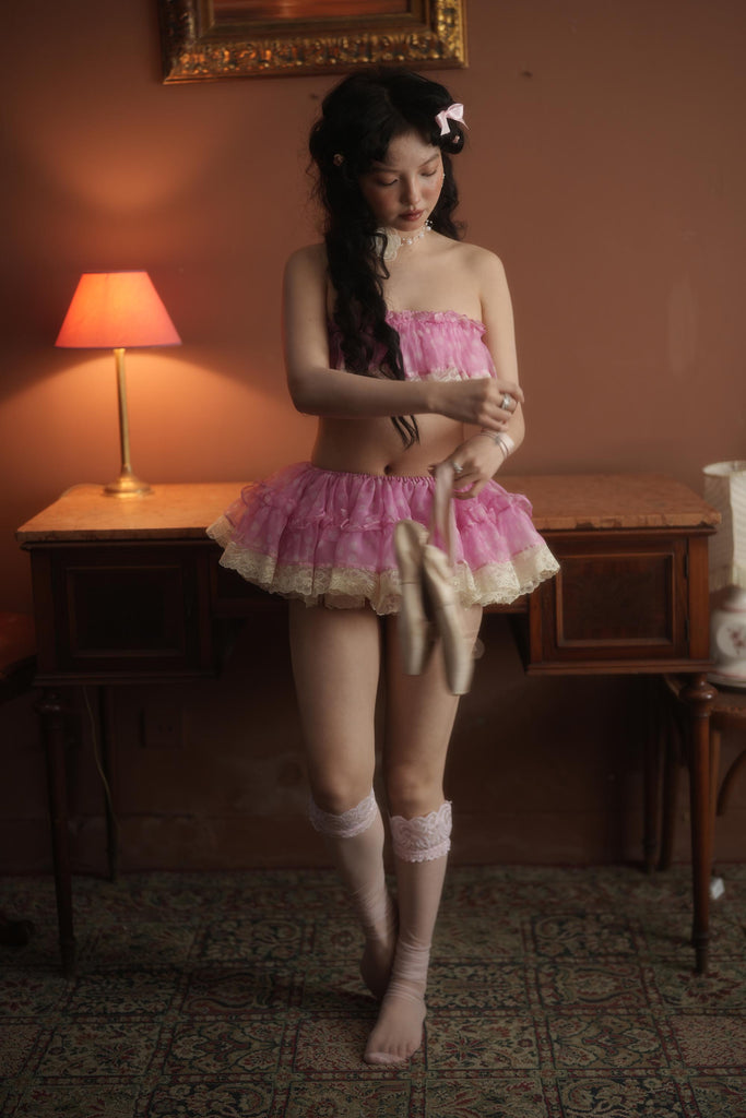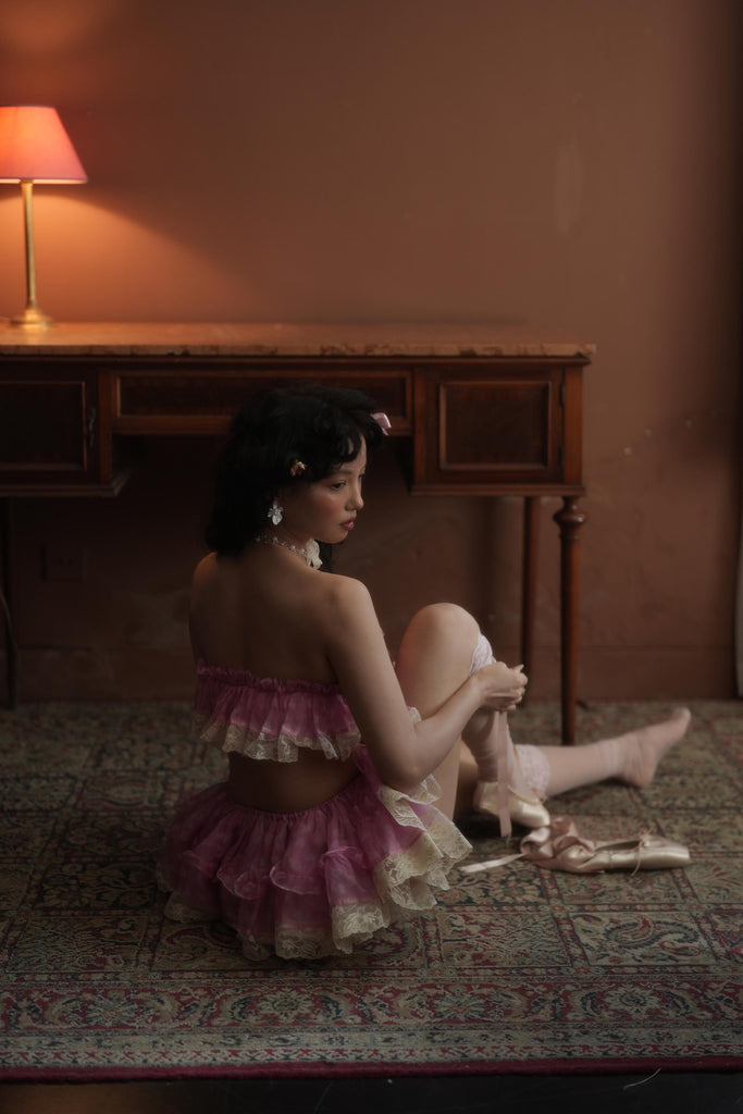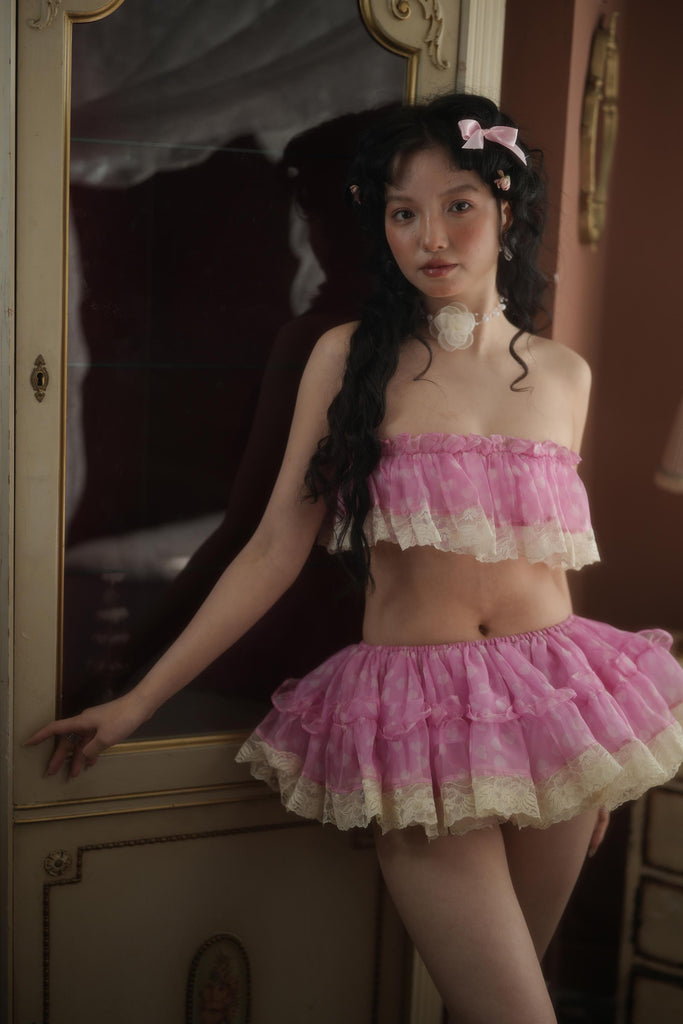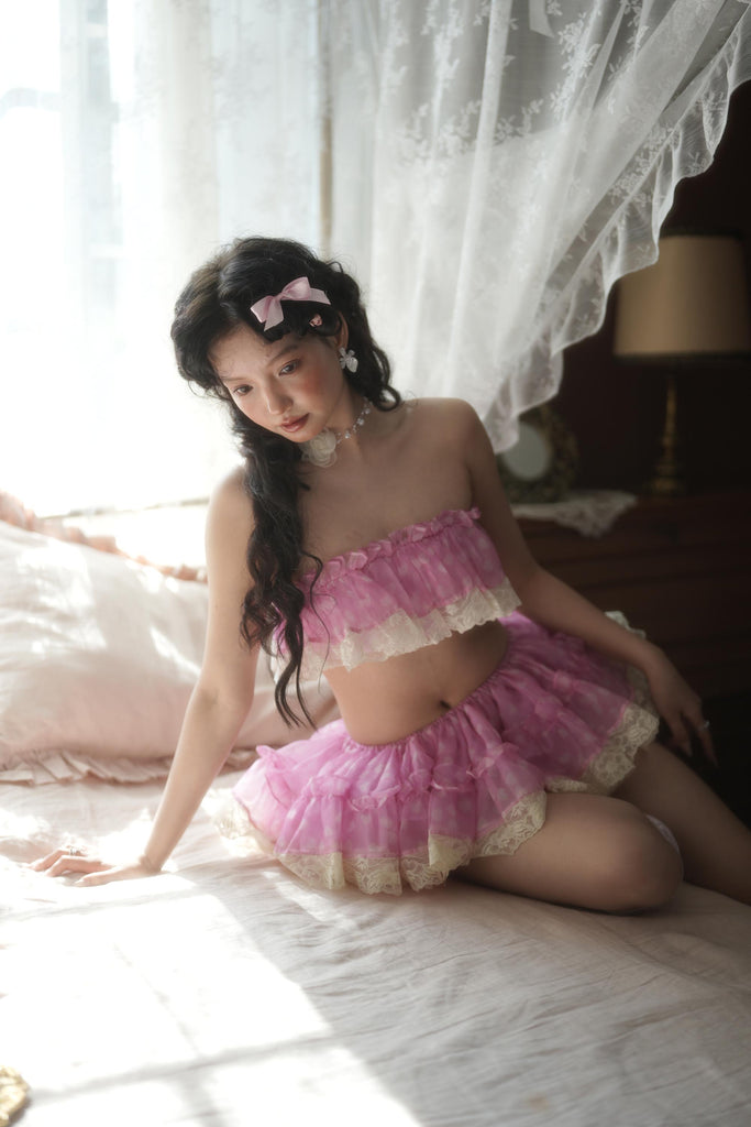Whether captivating onlookers or indulging in a Victorian daydream, delight in the sensuality of this vintage-inspired set—featuring a stretchy panty and a charming cotton mini. Adorned with delightful ruffles and lace trim, the skirt provides mid-full coverage, playfully reminiscent of a bygone era.