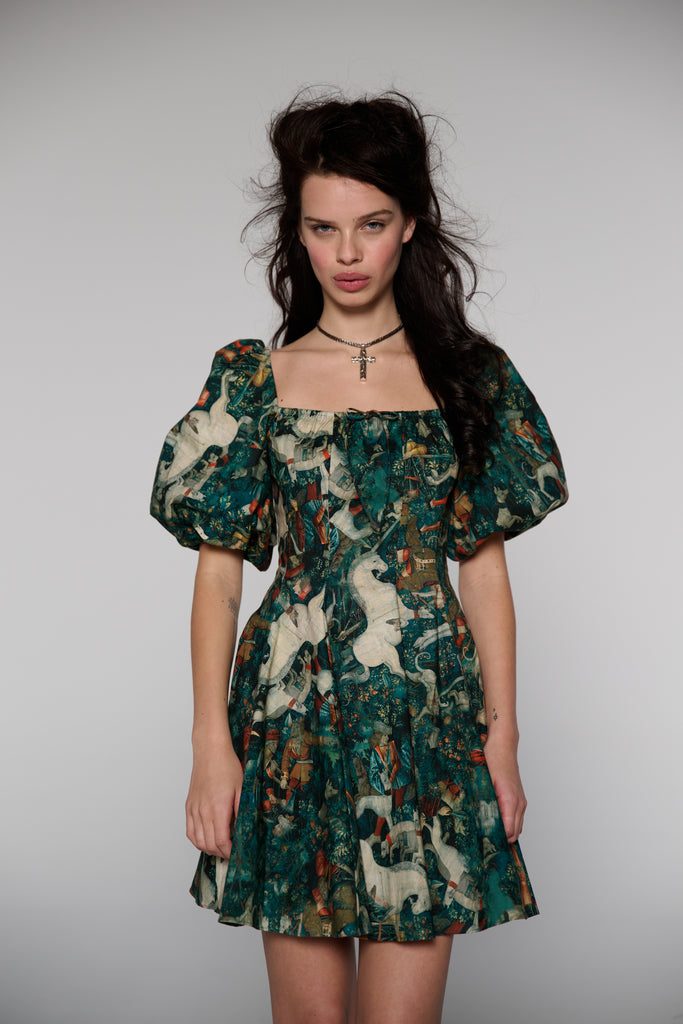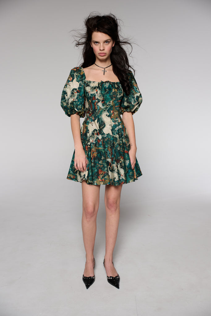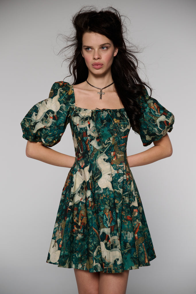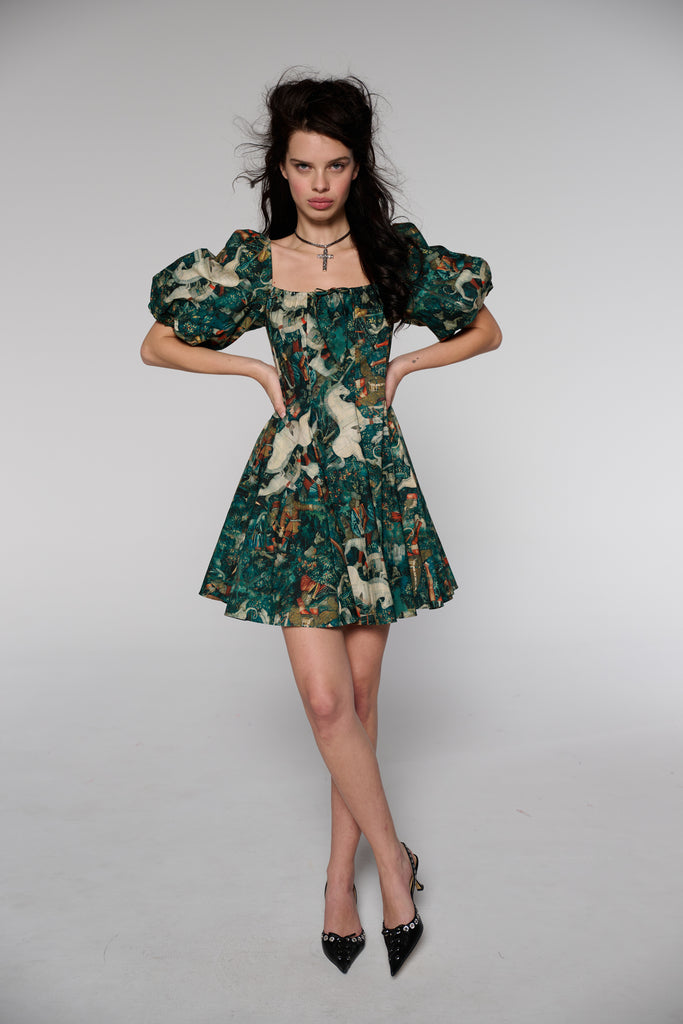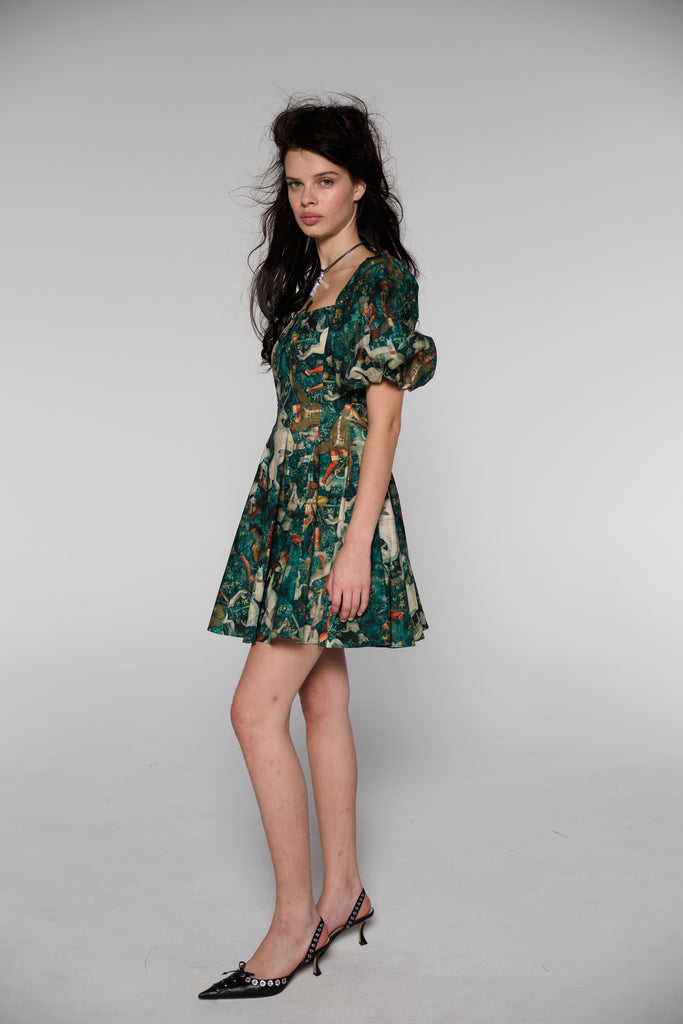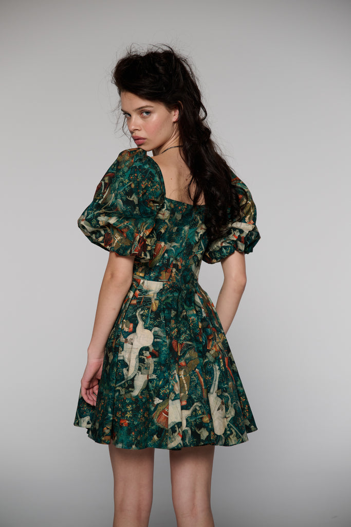 This mini version of our classic Day Dress features dark botanical prints that bloom with mysterious beauty. It features a comfortable cotton cut with curve-hugging princess seams, voluminous puff sleeves, and an adjustable tie at the bust. Crafted entirely from cotton, this dress remains cool and crisp, ensuring maximum comfort.