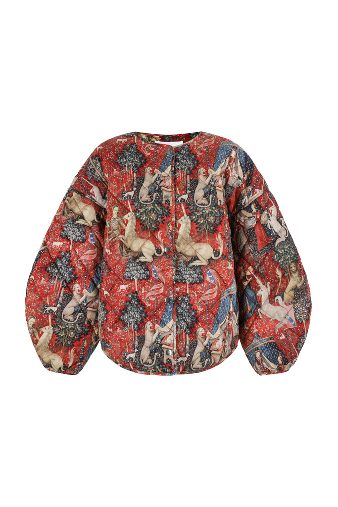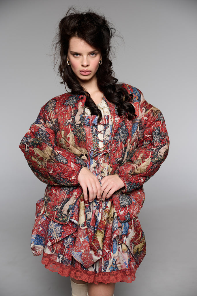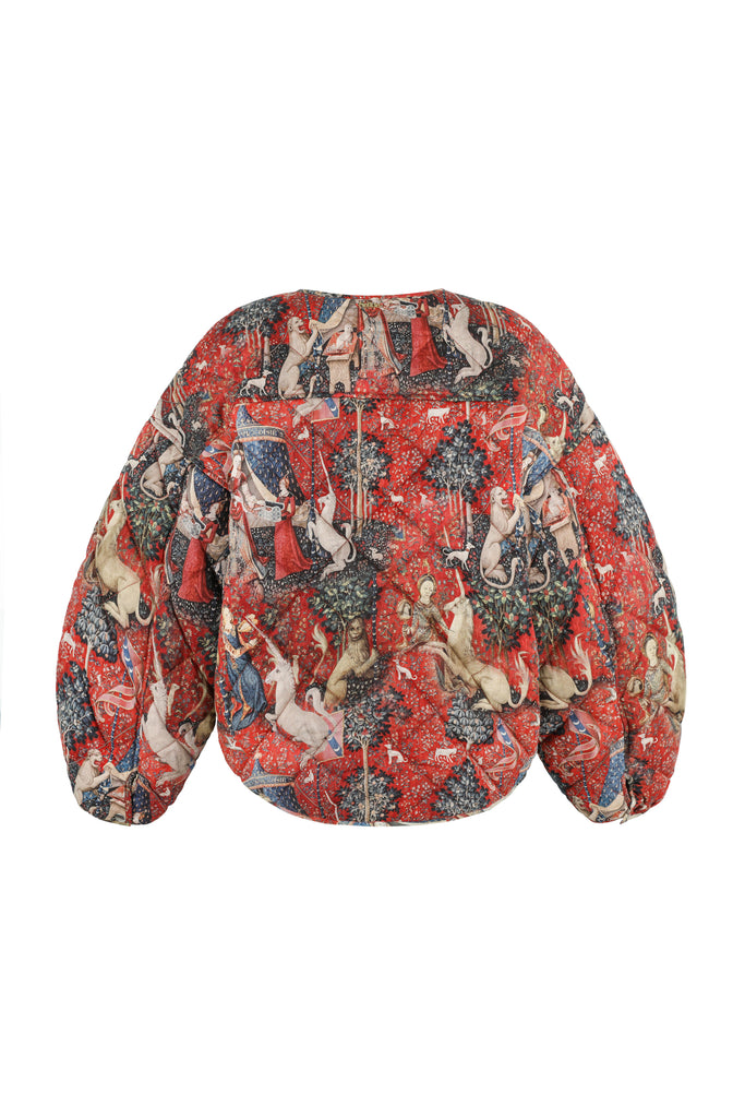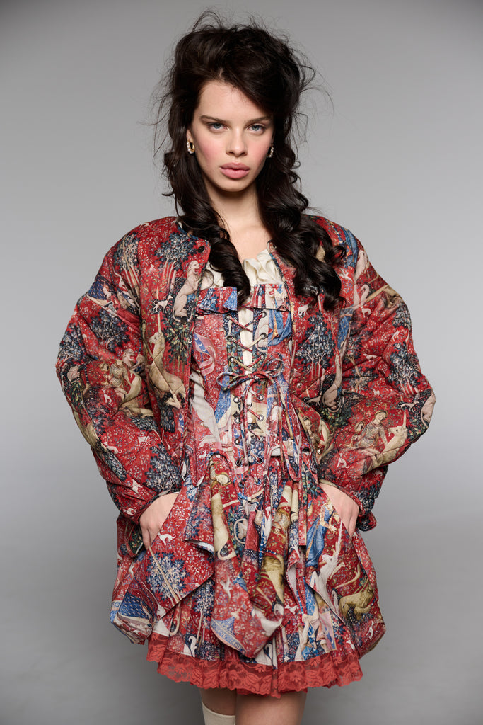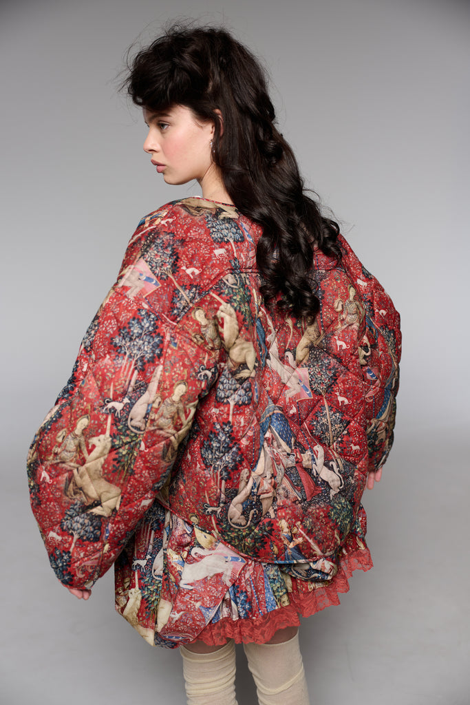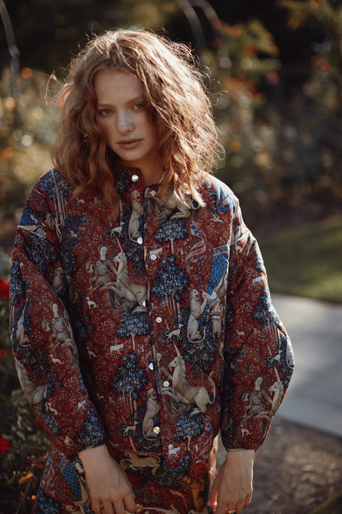 Drawing from one of Western art's great masterpieces, this cotton gauze puffer coat features the 15th-century Lady and the Unicorn tapestries from Paris's Musée de Cluny, alive with medieval flora, fauna, and heraldic symbolism. The oversized quilted silhouette creates cozy volume while snap button closures ensure effortless wear. Perfect for those who believe in unicorns, medieval romance, and the power of legendary beauty.