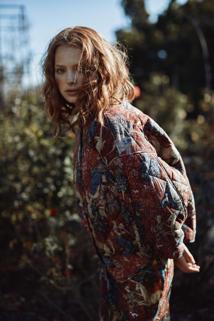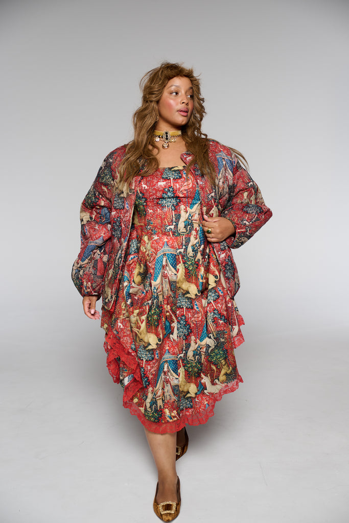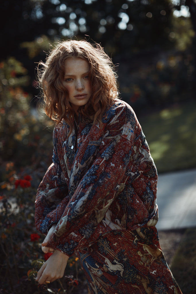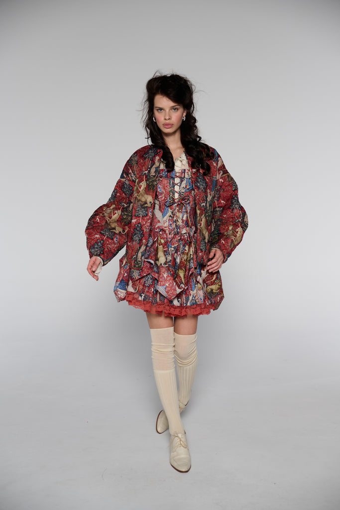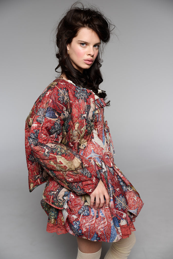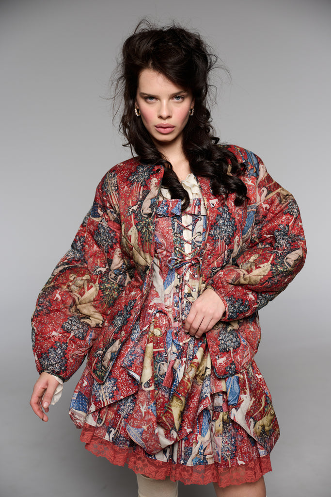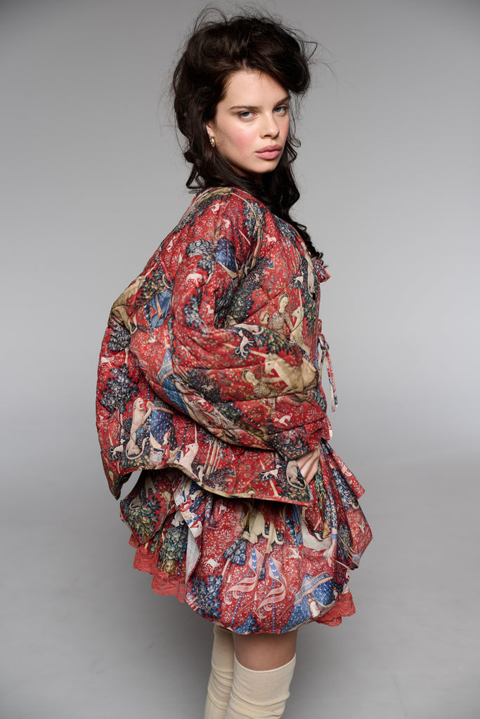 Drawing from one of Western art's great masterpieces, this cotton gauze puffer coat features the 15th-century Lady and the Unicorn tapestries from Paris's Musée de Cluny, alive with medieval flora, fauna, and heraldic symbolism. The oversized quilted silhouette creates cozy volume while snap button closures ensure effortless wear. Perfect for those who believe in unicorns, medieval romance, and the power of legendary beauty.