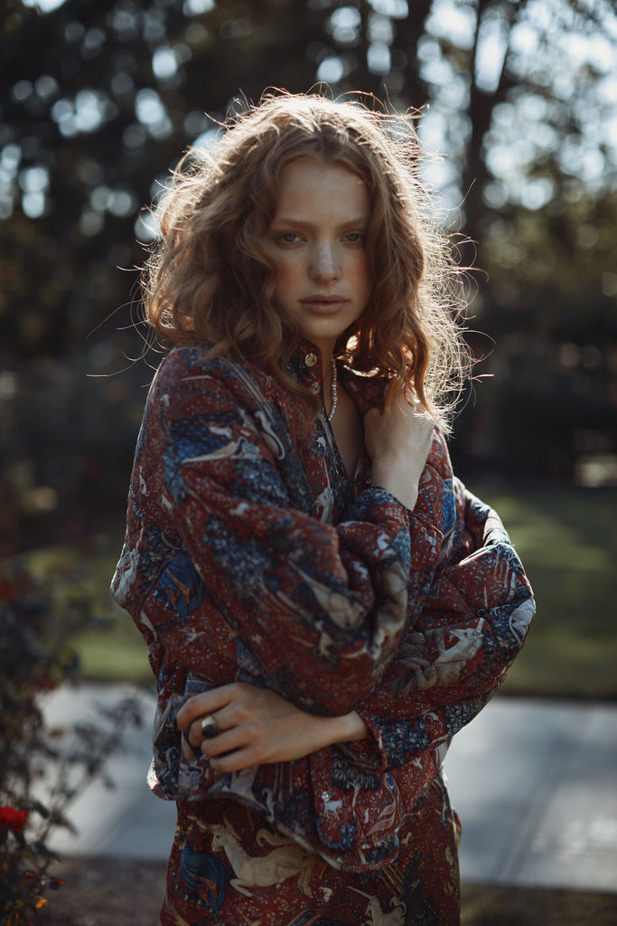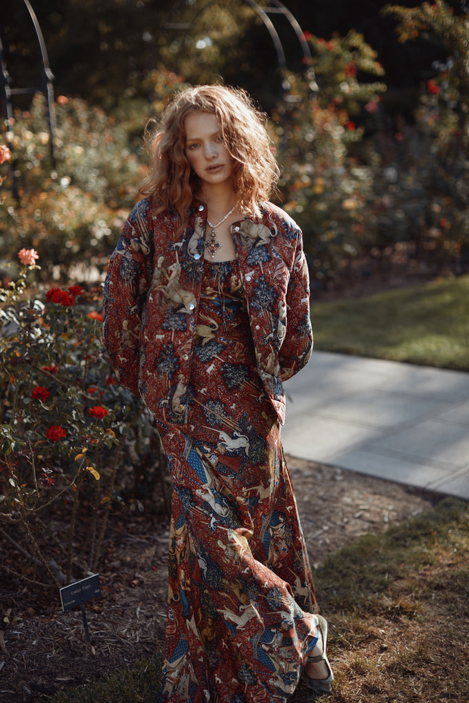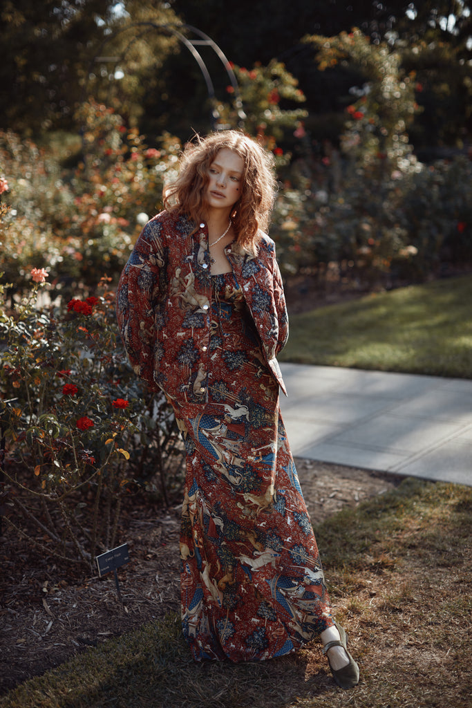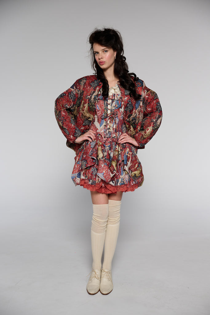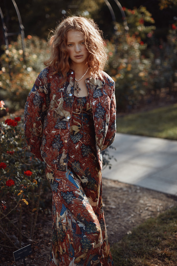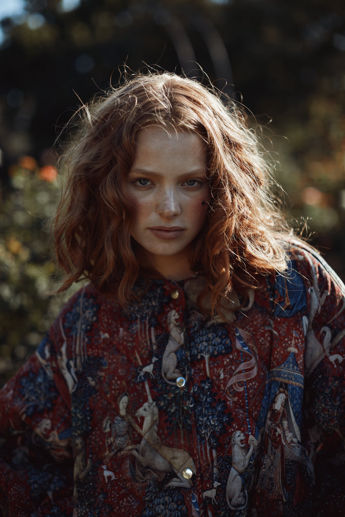 Drawing from one of Western art's great masterpieces, this cotton gauze puffer coat features the 15th-century Lady and the Unicorn tapestries from Paris's Musée de Cluny, alive with medieval flora, fauna, and heraldic symbolism. The oversized quilted silhouette creates cozy volume while snap button closures ensure effortless wear. Perfect for those who believe in unicorns, medieval romance, and the power of legendary beauty.